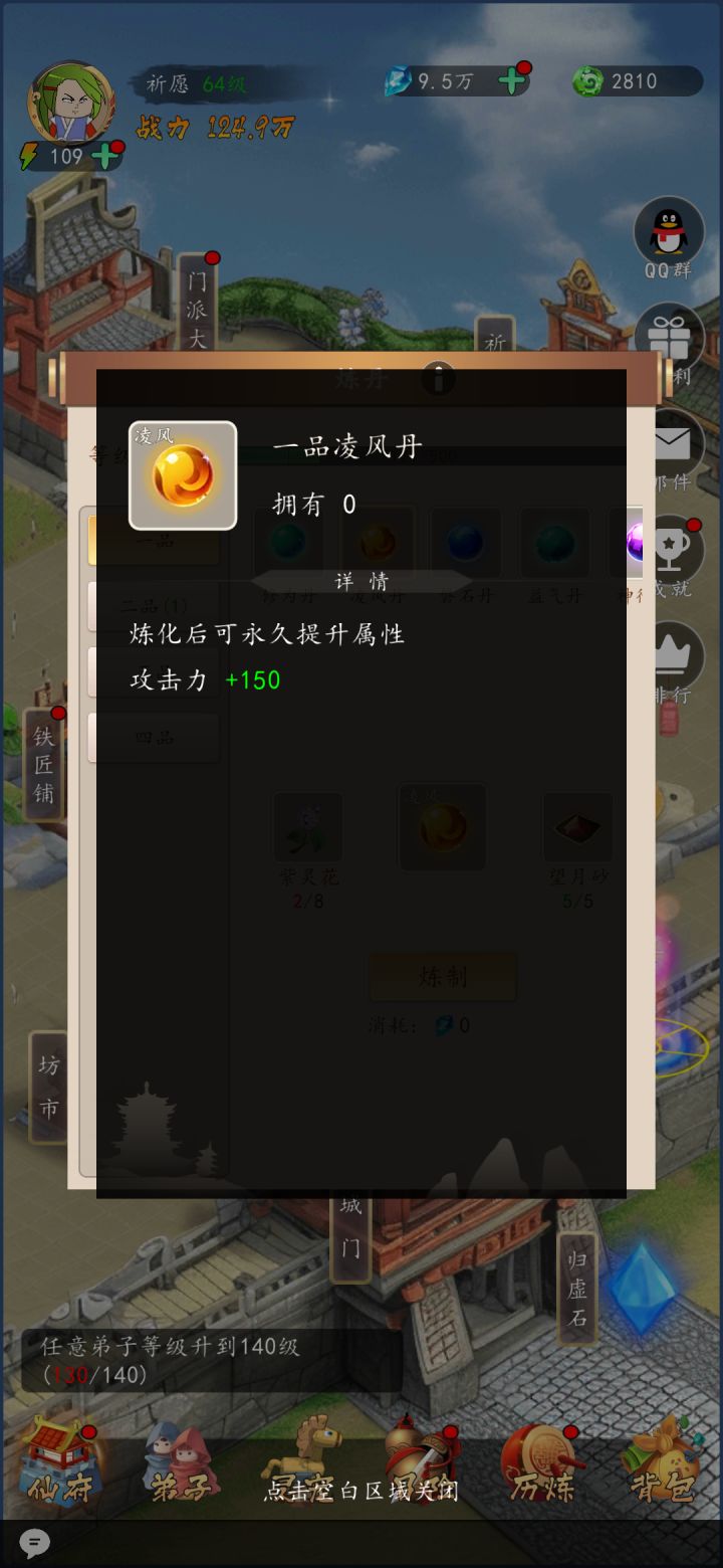 二、说下初期战力提升方向第一步战力提升,在主界面门派大厅,捐献拉满,然后前期秘法只用点生命攻击防御,性价比最高。然后是阵容搭配,上阵同五行属性的弟子有额外的属性增幅,提升很大。然后是等级,突破,进阶,丹药,装备。1、等级,突破由于目前游戏关卡与副本战力跨度很大,所以雨露均沾的提升等级方法不适合,更偏向于优先培养单核/双核,其他位置带控制武学为核心c提供输出条件来过关。提升等级需要修为,修为由