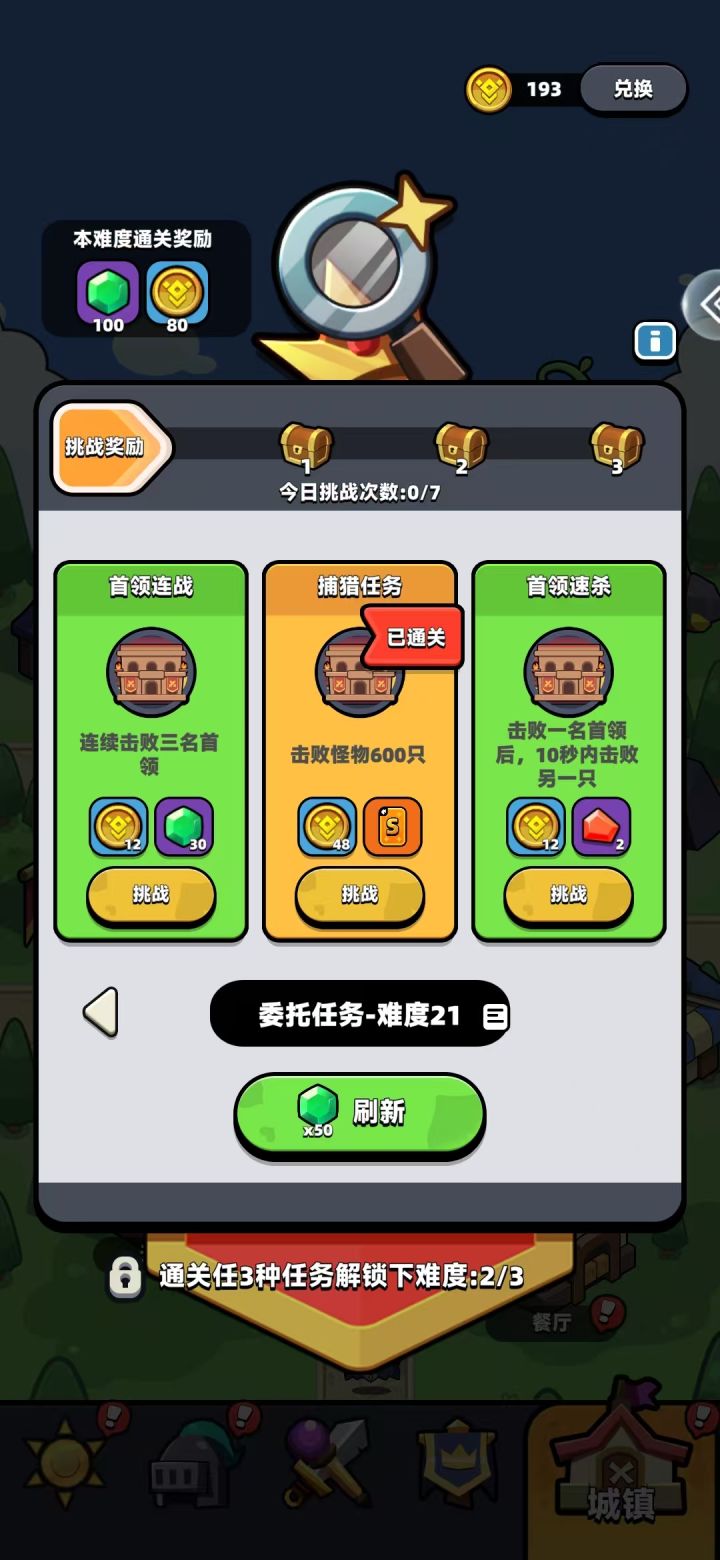 悬赏榜是开服六天,通过第18章就可以解锁的一个功能。 难度刷新概率:难度1=绿色53蓝色32紫色15,(解锁橙色任务)难度21=绿色43蓝色32紫色22橙色2.5(解锁红色任务)难度41=绿色43.5蓝色32紫色17.4橙色6.5红色0.6图中如果刷到饰品和紫色装备必挑战。而刷到紫色首饰和装备我教大家怎么(拿两次),只需通关本难度领取奖励后,再回到上个难度扫荡,就能拿两次。 战力比较相近的话