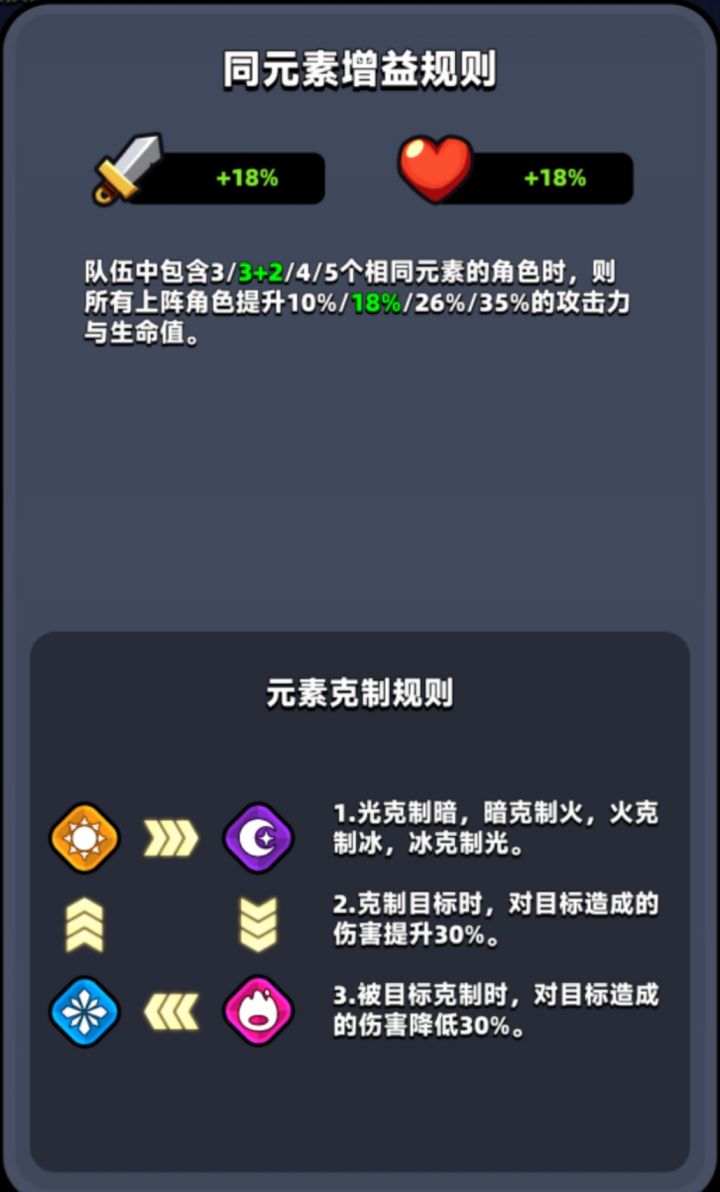 冰→光→暗→火→冰同元素加成有4种,3同加10%,3同+2同加18%,4同加26%,5同加35%攻击力与生命值。光普攻弹道伤害:埃及艳后,丘比特,匹诺曹,爱丽丝。普攻范围伤害:亚瑟王。普攻近战伤害:孙悟空,灯神。大招弹道伤害:爱丽丝。大招范围伤害:埃及艳后,匹诺曹。大招近战伤害:孙悟空,丘比特。暗普攻弹道伤害:灰姑娘,妲己 ,拇指姑娘,桃太狼。普攻范围伤害:辉夜姬。普攻近战