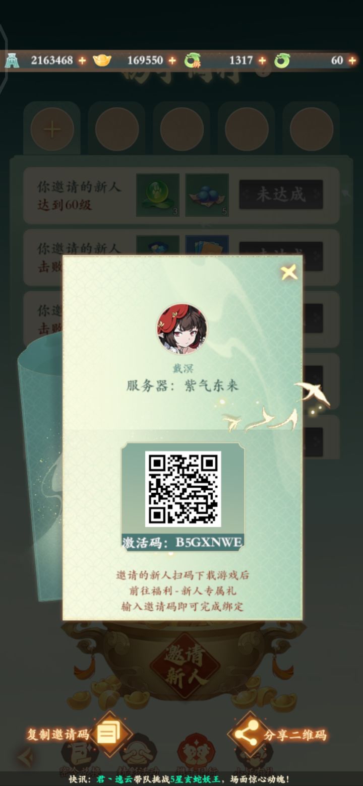 新人专属礼,填了邀请码有东西领,轻松养眼,好玩不累!恭喜您获得【封神幻想世界】新人专享礼!绑定邀请码:B5GXNWE进游戏点右下角工具栏展开,设置左边的福利,天点击填写邀请码可获得新人专属礼包