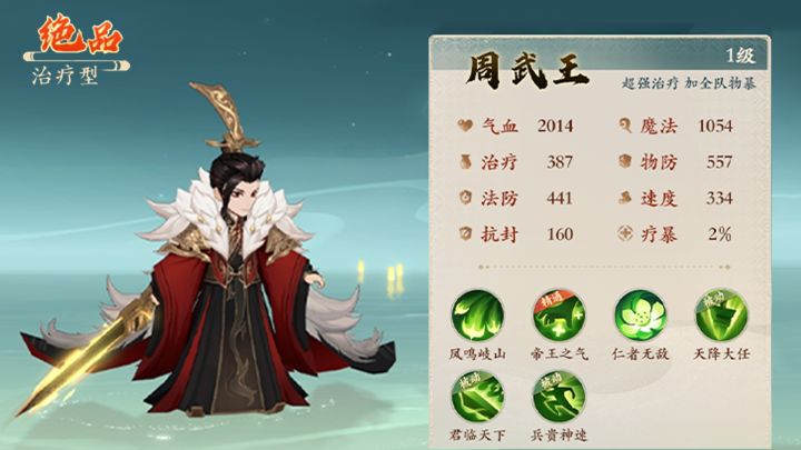各位天命之人,大家好~ 在封神故事里,有这么一个人物,他少年意气风发,能文能武,号令着封神众武将灭商讨伐,成为了大周的开国君主!他就是周武王! 了解封神的大人都知道,周武王虽然是一代帝王,但武力值其实并不如其他神将,周武王的技能点在于用人、用仁! 在游戏里,周武王亦是如此。他是绝品级别的治疗系伙伴。拥有超强治疗技能的他,能同时治疗多个角色,配合被动技能可在对局中实现多次治疗,能在关键时刻复活
