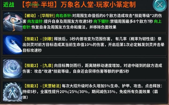 熊猫一个所有技能都是范围伤害的英雄,在清除小怪方面非常不错。并且被动每次释放技能都能获得护盾防止被怪物打死。 装备推荐 无量拳(⭐️⭐️⭐️⭐️⭐️)群伤 渡魂钟(⭐️⭐️⭐️)增加生命 鬼灵刺(⭐️⭐️⭐️)怪物血量越低伤害越高,二技能会造成敌方最大生命值,所以搭配起来很舒服。 屠龙刀,科技枪,落日弓(⭐️⭐️) 天赋加点 满级攻击,金币,暴击,生命,冷却 2家园卫士,2掉率,4命中 局内