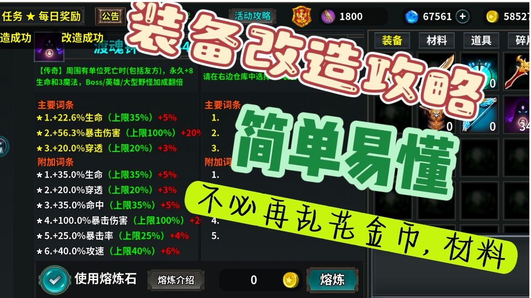 大家好,我是悲欢给予谁 今天出个主词条熔炼攻略讲解 首先需要使用最少2个或以上的熔炼石 然后准备例如视频所需的装备词条,我今天熔炼的是(魔法%,魔法数值,冷却)其中魔法数值和冷却是单词条 熔炼在不使用熔炼石的情况下是使两边的词条进行融合(主词条3个,副词条5个)如果超过这个标准那词条将会随机的替换!! 熔炼石:使用熔炼石将会保留左边词条(满的情况下)如果没有满会把右边的最上面的词条转移至左边如视频