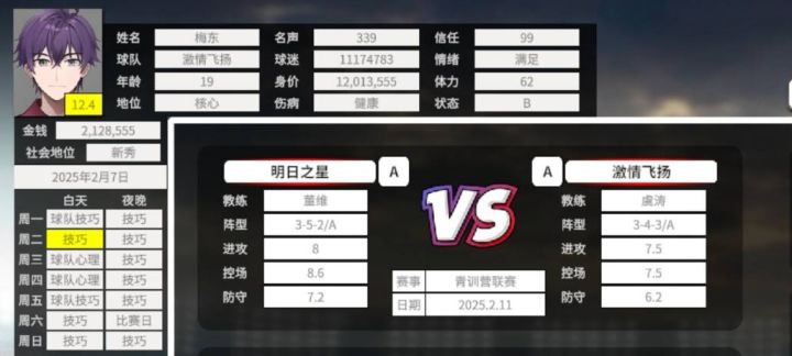 传送门:一、左上方1.信任值。每次比赛日点击活跃气氛能稳定+2高状态的参加俱乐部的训练,每周一三四五上午主教练的训练一定要保持体力>25并且参加(参加方法:直接点击下一步就行,不要自行去训练场和心理室),不参加的话有概率获得旷工特性(很久才消除),会持续减信任,导致上不了场。状态高每次训练结束会+信任值。每场比赛结束,表现好会+信任。2.状态。每天上午随机刷新状态。受到情绪值和心态属性