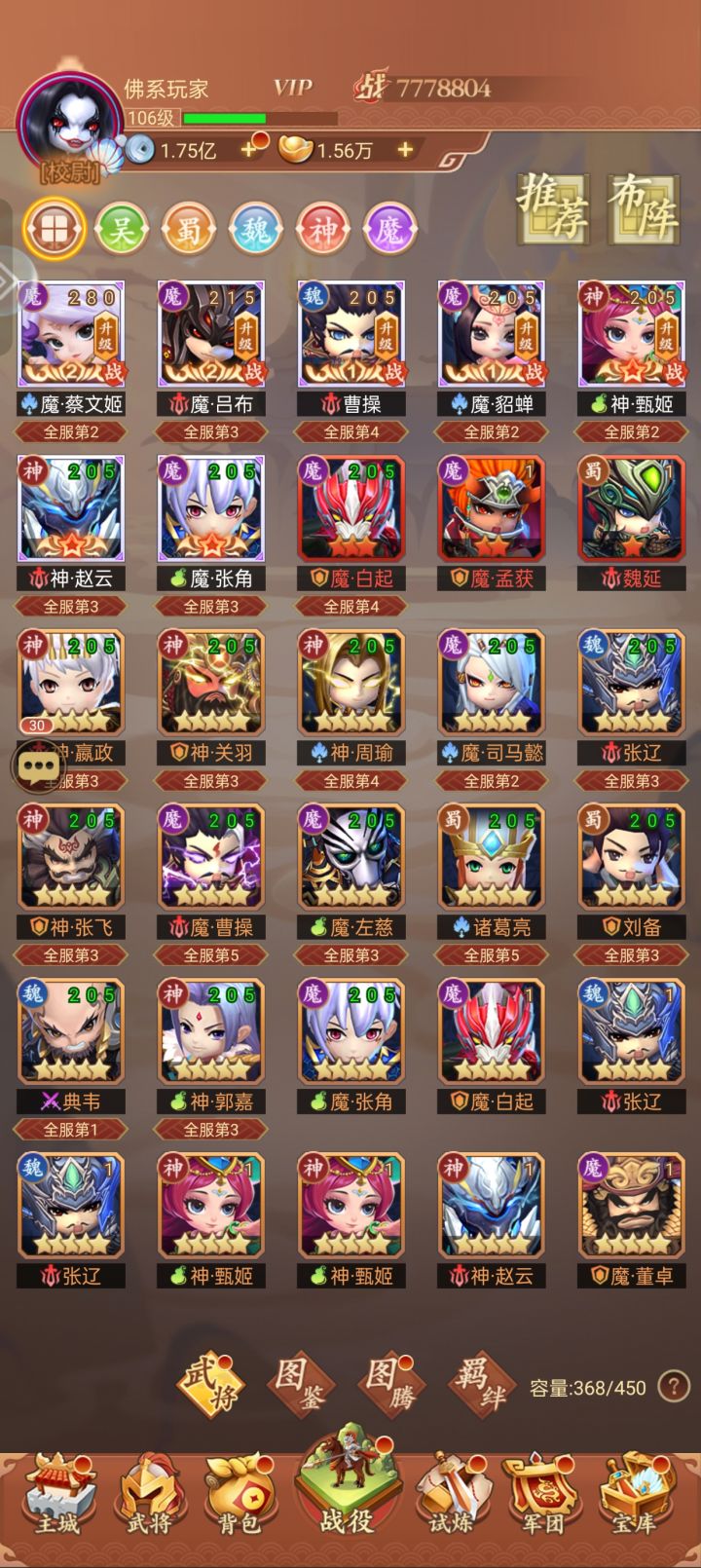 基础开局:首充6元,其他不需要氪,不充也无所谓,开始来啥英雄用啥英雄,16资质或以上的随便用,能升星就升星,9星10星最后都是肥料,无限十连选魔吕布或者神关羽,为啥不选20资质的?因为养成难,后续阵容也是,贫民存元宝尽量弄一个魔蔡文姬,其他以17资质为主,因为各种商店里都可以换,不需要氪活动阵营选择:对贫民而言,不是很重要,这里注意一点,是准备长期玩,还是随便玩玩,魏蜀吴阵容加成少,但是容易