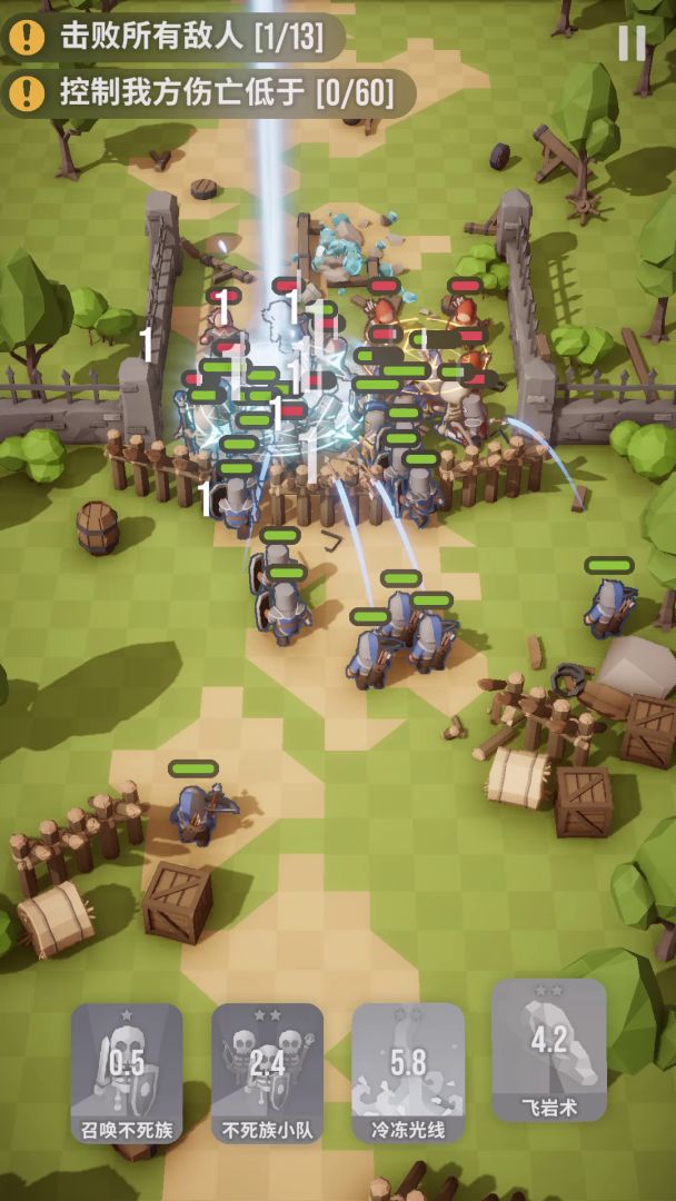 魔法选 [飞岩术], [召唤炸弹], [召唤不死族], [不死族小队].用骷髅尽量把敌人挡在冰面上, 然后用前两个魔法炸冰面. 这里不用怕友军一起落水, 反正骷髅冷却也快.选前两个魔法是因为冷却快, 破坏冰面效果好.#魔法突袭 #游戏攻略