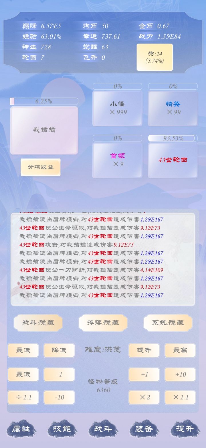 开局基础设置不多讲,直接进主题开局,属性满力量,技能刷疯了,打痛痛,打BOSS,先提升怪物等级,接近100级,升难度,前期别点幸运儿,装备属性也不要幸运,先刷一套90几级装备(没觉醒最高装备等级100)就考虑转生了,打BOSS技能洗点加100点“啥是护甲”前面几转就是这样过,然后就是第一次觉醒接着也是按这个套路攒10觉,打不过可以打打魔王,提升三围,通天塔,100层通天塔送一个永恒刷新一下通天
