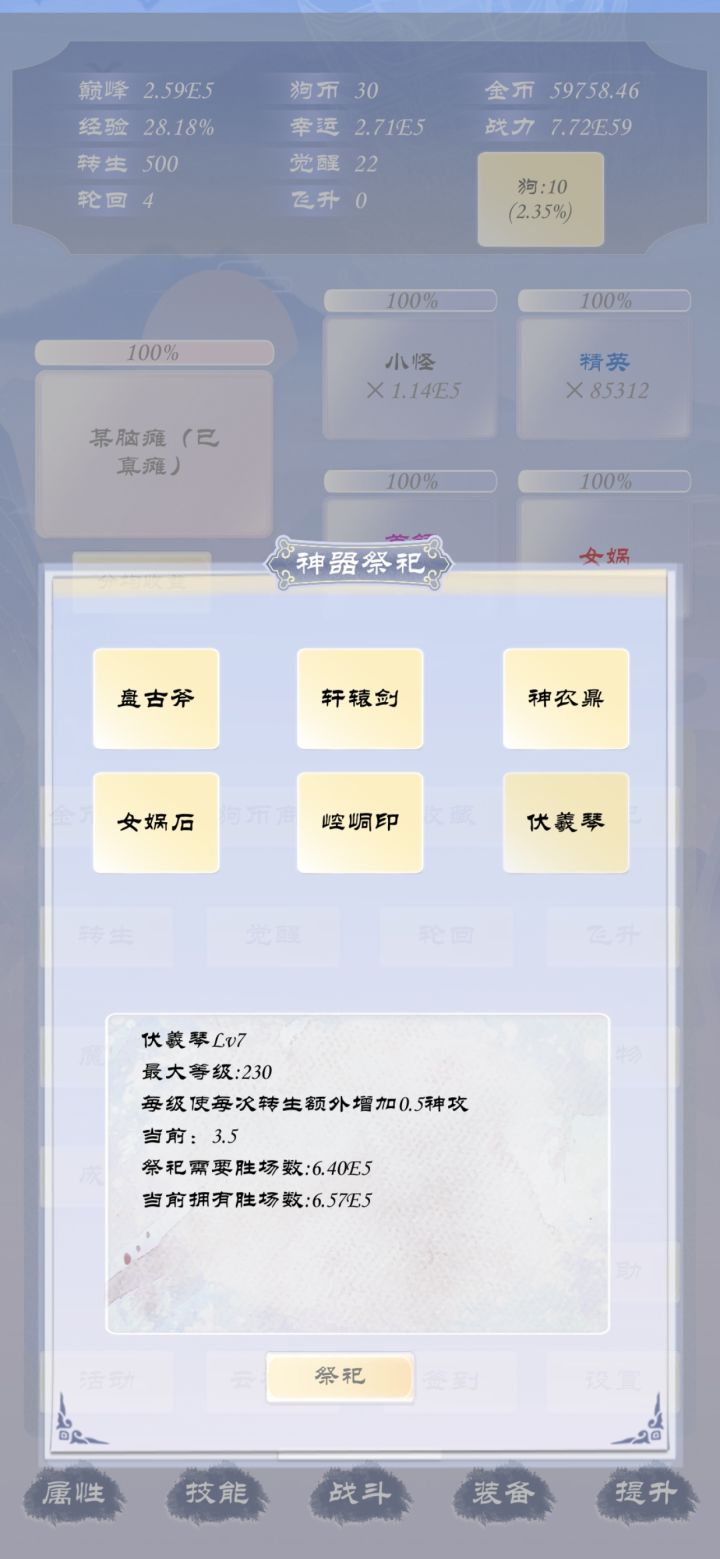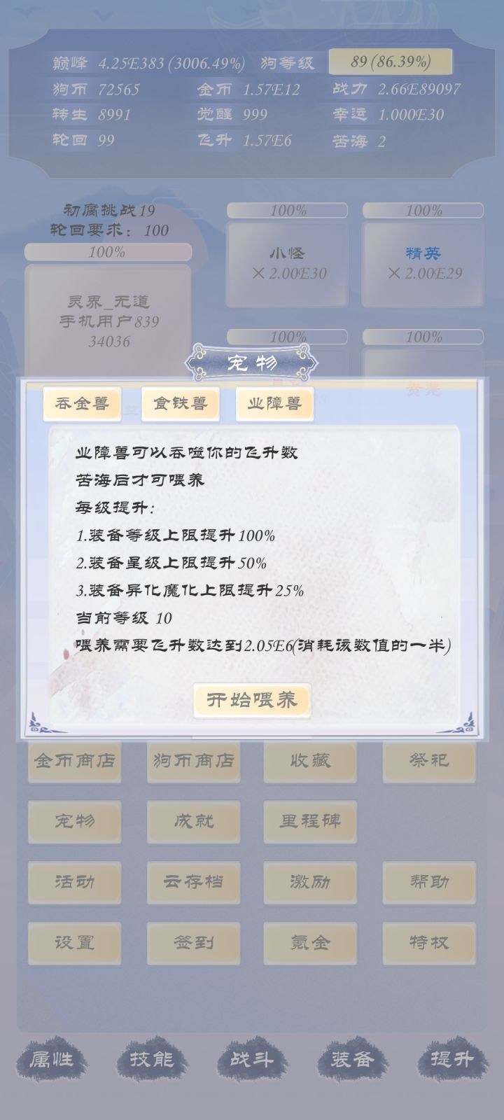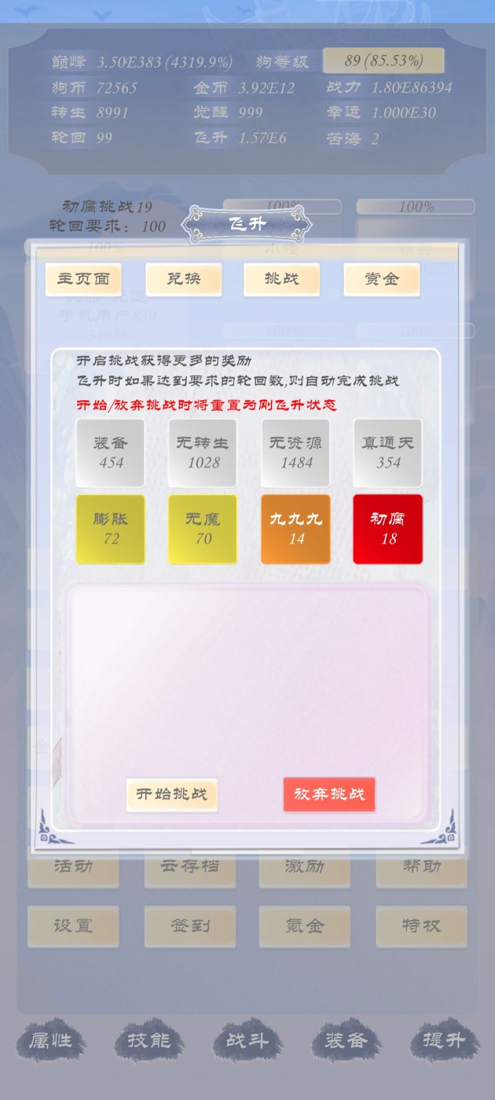 tap附图很不方便,不会插入图片,附了几张意思一下游戏基础流程很明确,转生-觉醒-轮回-飞升出门第一步,雀氏纸尿裤(bushi)首先是刚登场,只能打过一级怪,游戏的主要流程都在下面的提升里,几个境界,宠物,塔,魔王都在这个界面,如图2游戏有一些内置帮助,有的不在这里说明功能介绍:1.转生、觉醒、轮回、飞升,字面意思,境界 游戏的主线,有啥东西和奖励里面写了2.魔王和通天:属性增幅,通
