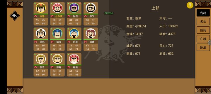 玩了马腾,噩梦大图。好难。首先,东出消灭董卓,收服了吕布等武将。可惜吕布高顺马超都是不羁的。然后继续东出,打残了曹操。然后没有人口了,没有兵力,就就就得寄了