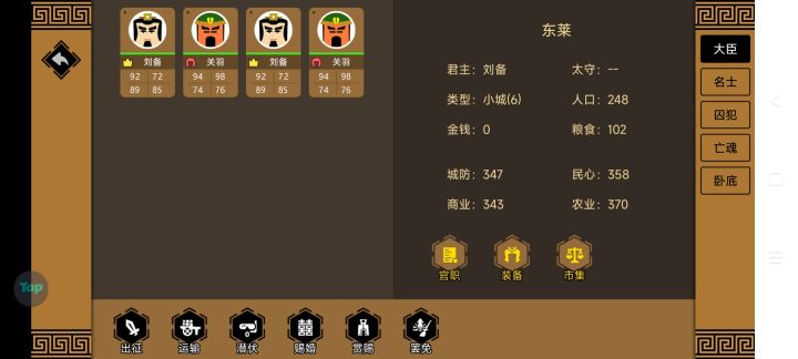 建议给特定人物加特定装备或者技能,比如关羽的刀,吕布的赤兔马等等。技能的话类似于黄盖自带水性,骑兵加成,(未来不受技能影响)等等等等,让名将不再是数值高。。还有守城可以有更好的地形吗,目前还是做不到一将守城的。建议加固定血量的城门设定。或者太守点有更高的防御。