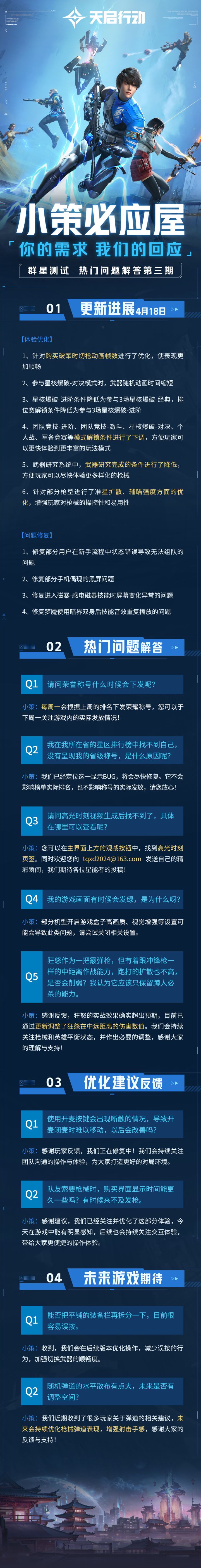 说小策,小策到!各位亲爱、敬爱,还有大玲心爱的星能者们,我又带着小策来开新闻发布会啦自群星测试开启后,我们收到了来自不同渠道星能者们对游戏内容的建议。我们深知每一个建议都是不断优化游戏内容,不断改善游戏体验的重要佐证,请各位星能者放心,天启行动不会忽视任何一位玩家的心声如果你有其他疑问与建议,欢迎在评论区或其他渠道积极留言,每一条大玲都会仔细看的!也可以在往期