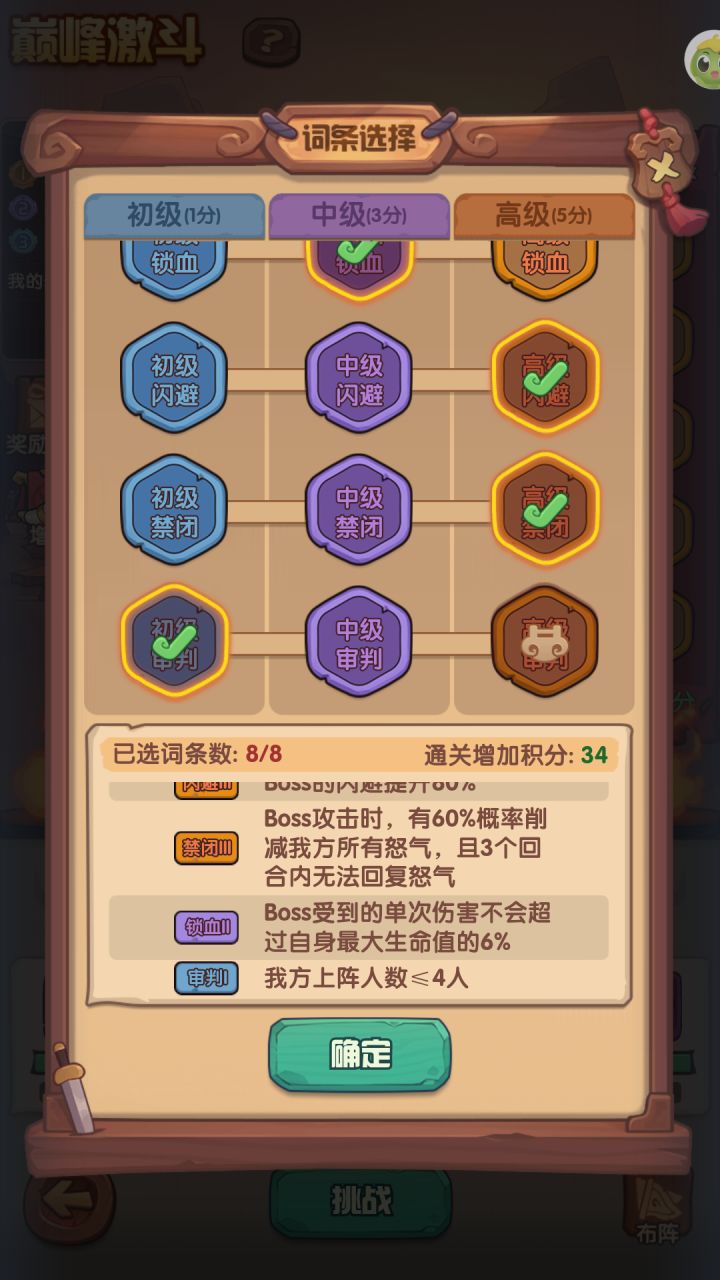 如果你开局选了曹操作为主C那么在第七天开启的曹操皮肤活动巅峰激斗玩法中会完全处于劣势.这套阵容可以在一众吕布貂蝉和关羽蔡文姬的阵容之外拿到排行榜前10(当然要看前面氪佬多不多).1.战力达标第七天整队应处于3亿战力以上.2.兵符需要至少洗出一个击晕词条3.BOSS词条,开始可以先把除审判和锁血词条都开到高级.锁血开到中级即可4.不要怕闪避多减怒多都是几率的,总有一把是只触发很少几次的.多次