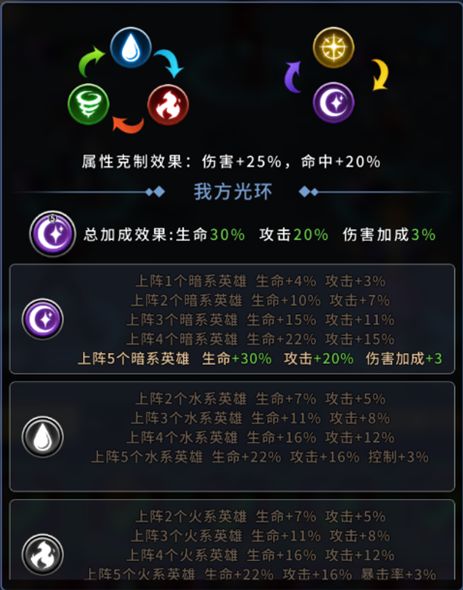 【强力输出,火系阵营の暴击流】火系阵营是个“偏科”阵营,就连辅助赛文也是个强力输出,但因为前期回血能力对比其他系的英雄表现一般,很多玩家会选择放弃其作为主辅助来培养。然而火系自成一体,战斗中给敌方附加的[灼烧]效果不容小觑,特别是很多技能在[灼烧]基础上大幅增益,伤害输出恐怖到让人灵魂颤抖。纵览火系阵营一共有法师7个,战士10个,坦克5个,辅助3个。英雄一览图如下:【种族克制&属性加成】火