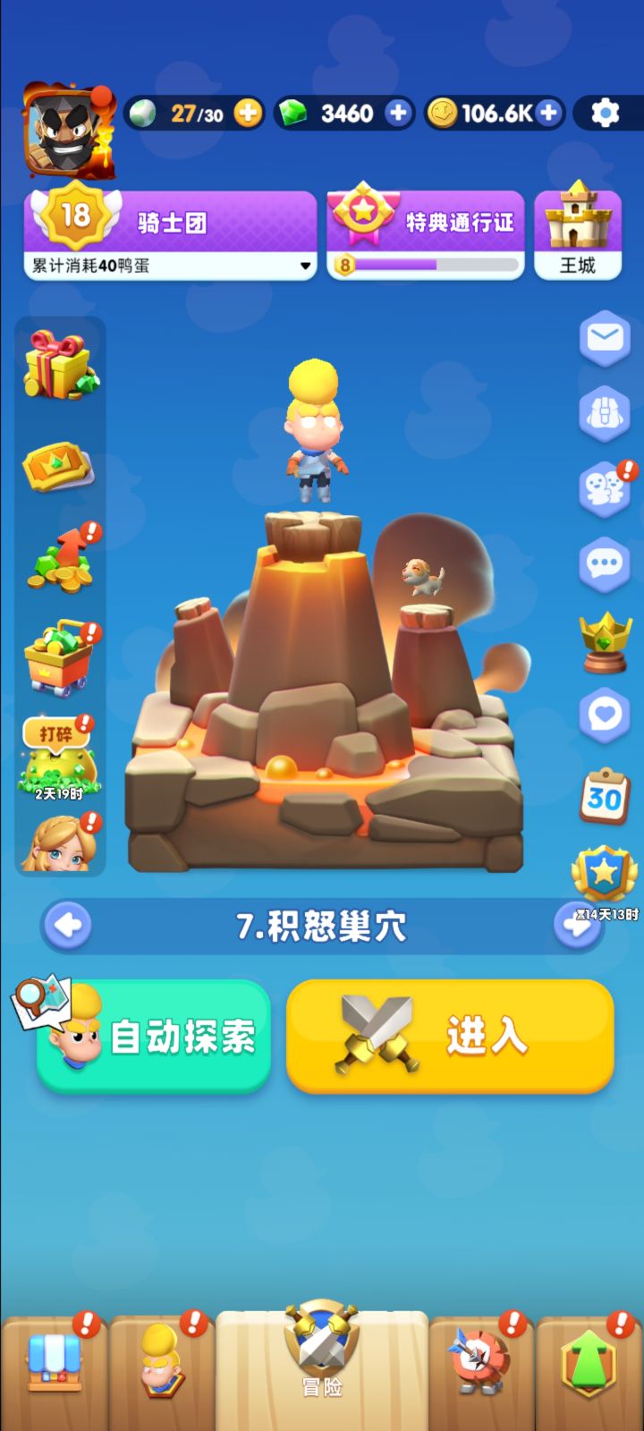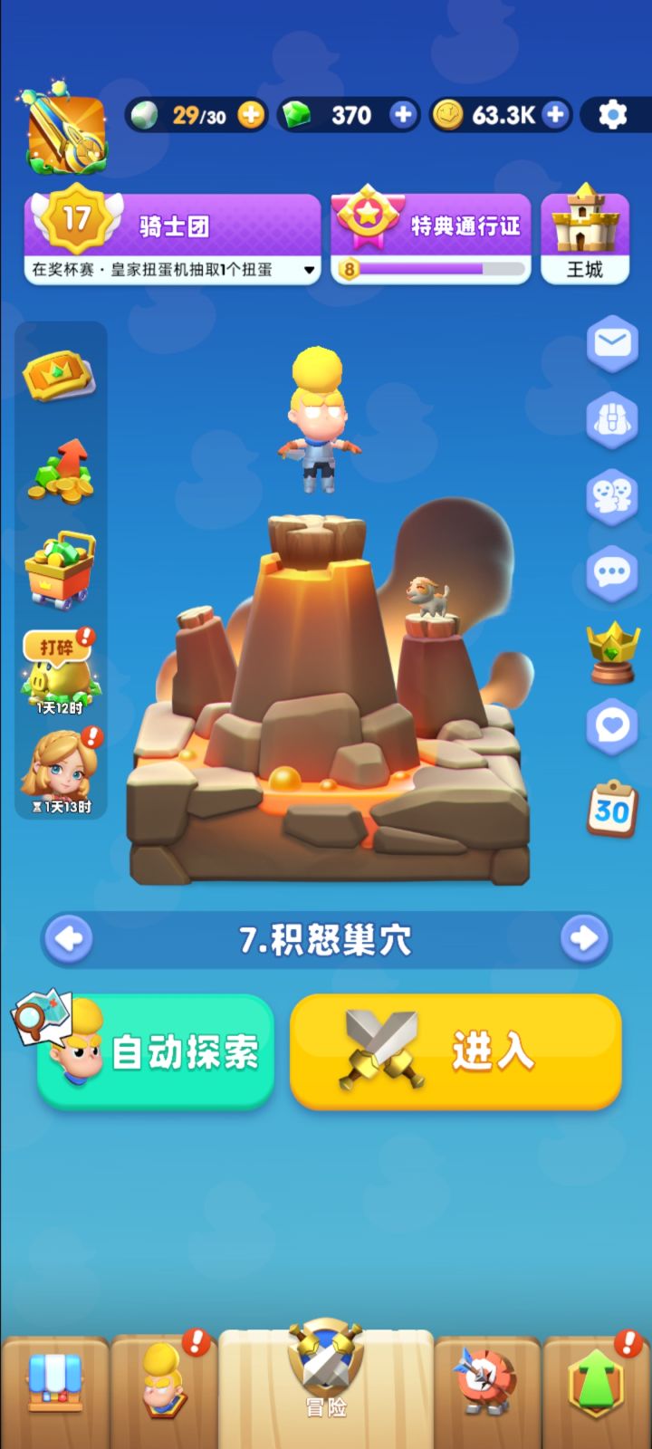 各位新进骑士好,大家在探索过程中,每隔一定时间就会进入奇遇,奖励非常丰厚,但是深入探索常常被打的体无完肤,拿不到奖励,今天我在这里教大家如何拿到奖励。首先大家进入游戏都是玩弓箭的,在奇遇中不能控制角色,所以每次都当活靶子,被怪物活活打死,这个时候我们为了不当活靶子,可以把武器换成近战武器,强烈推荐斧头,大转盘伤害高范围大,然后角色使用卡波奇,近战有免伤加成。近战行为攻击需要追逐怪物,所以角色会一