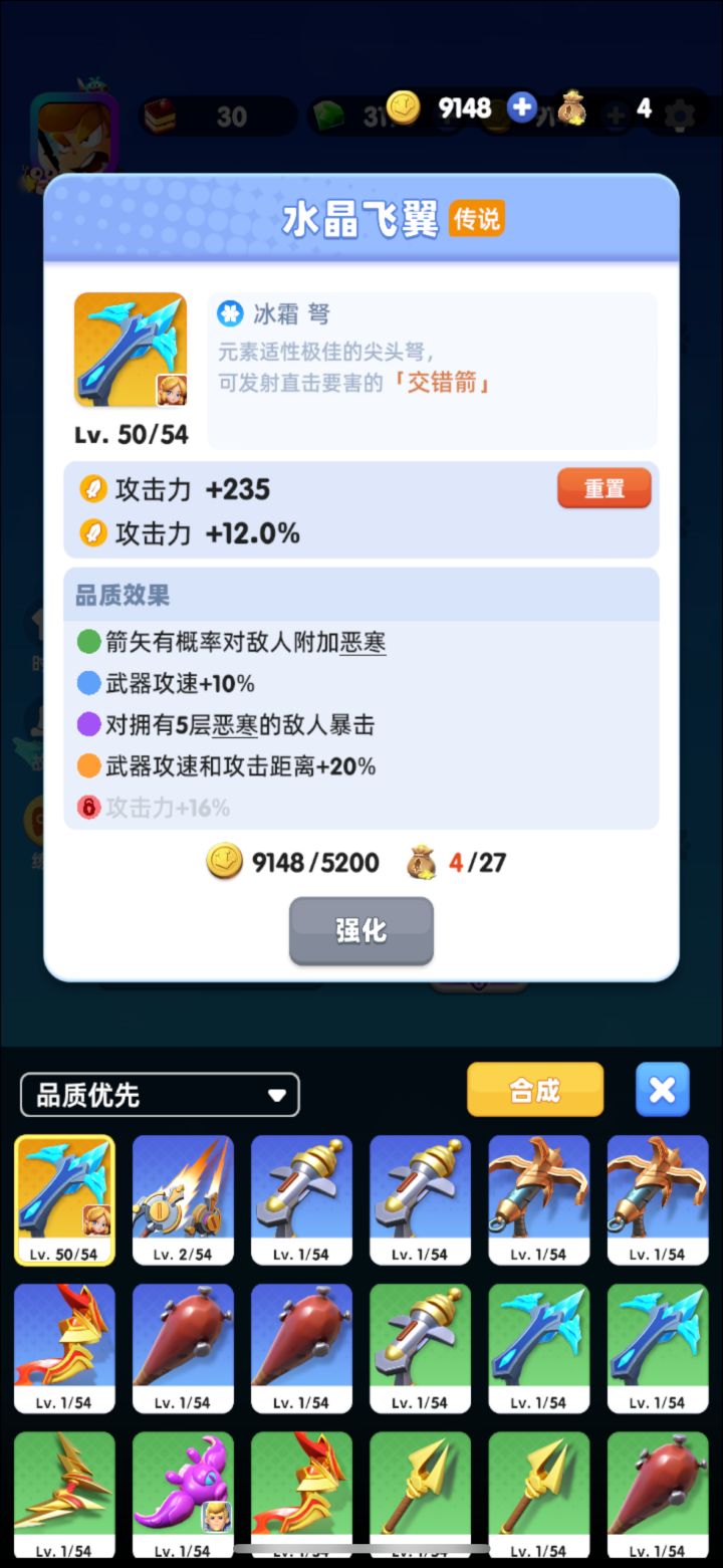 开服当天就参与了游戏,一共开了四个号(我太非)在过了1-4之后就能抽第一发十连紫球,我四次第一次保底都是技能球,然后第二次保底都是基本上都是斧头,但是因为我比较喜欢远攻(直接莽我会把自己玩死)所以就一直刷到出弓,不过对比了两把远程武器(新手送的简易弩,和抽到的弓)之后感觉弓和弩各有优异,弓箭的伤害更高,但攻速比弩慢,在选择风物卡的时候可以选偏向加攻速,攻击的。如果是用弩箭,风物卡推荐风刃,火球,冰