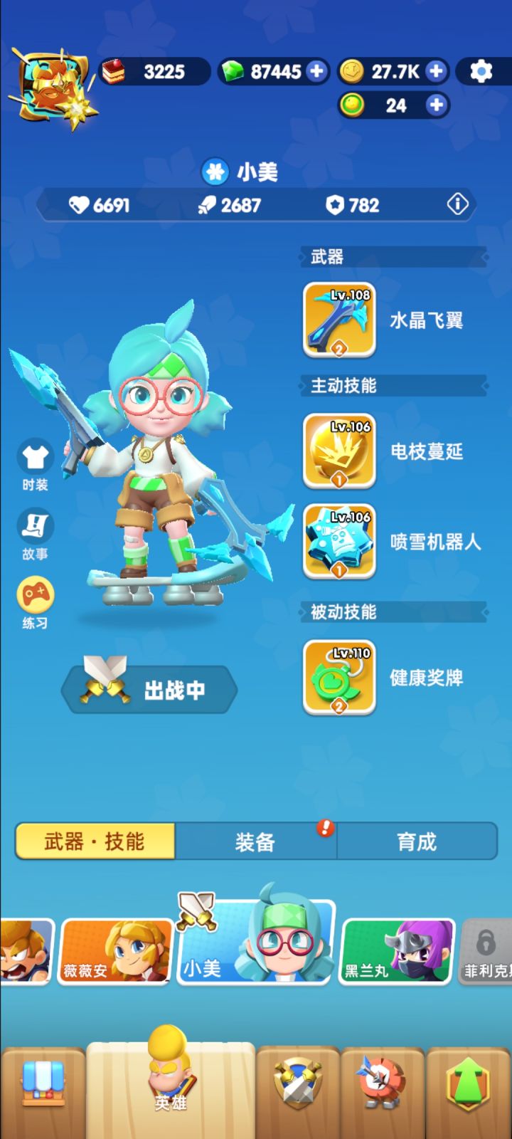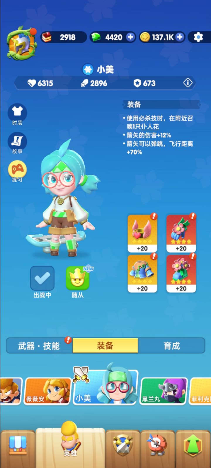 喜欢这类型游戏的容易上头,不喜欢的请默默卸载也别吐槽了。进入正题1.人物选择:不同人物有不同特性,比如小美🧍♀️能够边移动边攻击,忍者🥷可以闪避可以越过怪物等等。零氪可以慢慢嫖角色碎片,探索(就是收菜)每隔一段时间(12 小时应该是)会出现奇遇事件,会随机给角色碎片和自选碎片,只要玩得够久,想要的角色最后都会有。等不及的可以 128 买个特典通行证,直接得忍者。但是解锁新人物只是第一步,因为