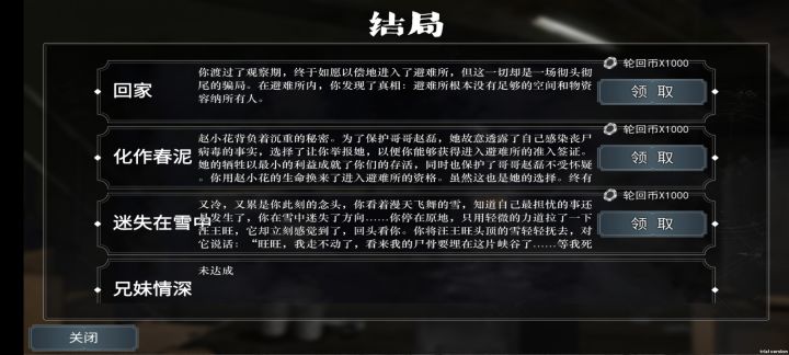 目前还差一个“最是人间留不住”结局,说一下所有结局。按npc分不太严谨,先这样吧,因为可以把每个人要注意的事集中说完。狗子线刷好感注意,给吃的,放地上让狗自己吃。好感开启小避难所地图1、迷失在雪中 在柯青手里拿到量子指南针之前,去狗子地图小避难所。主角、狗子死2、世外之所 在柯青手里拿到量子指南针,再去小避难所。主角、狗子活。柯青线刷好感注意。一定要选我有目的我想进避难所。不然他就不理