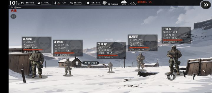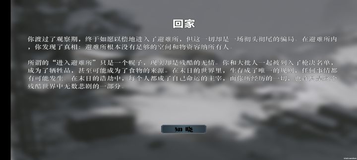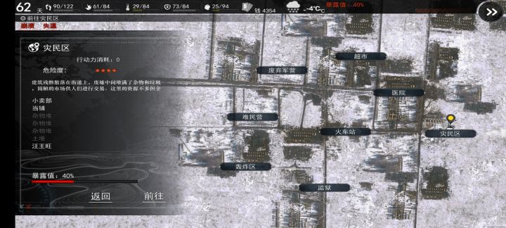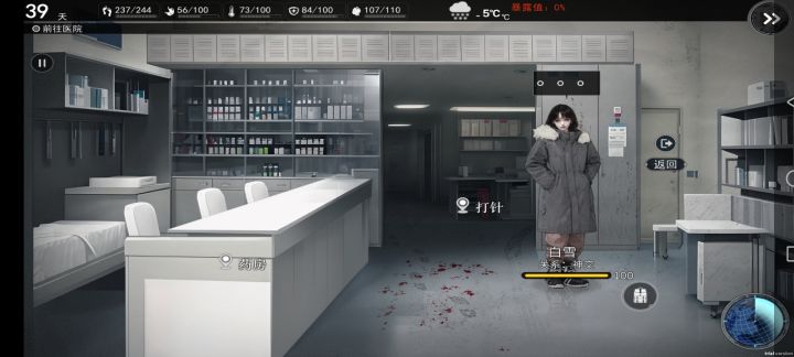 经过摸索和研究,发现一条躺平之路!灾民区前面每天和狗对话,关系满100后就别理它,因为结局是必死。小卖铺看着需要的就买,无关紧要。当铺无关紧要。医院每天去给白雪打针加1体力和3精神值,其实真的很费肾。还可以看看有什么补充体力的药。超市一百钱加50行动值,这个无关紧要。轰炸区和监狱没必要去。火车站关系满一百后每天给5个加25食物。灾民区,赵雷每天给材料和食物,饭堂也可以白嫖10的饥