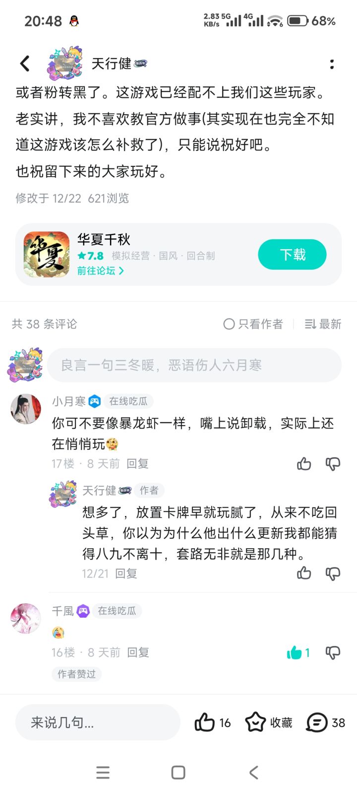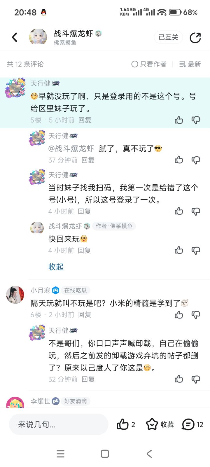 我确实是弃坑了,但是区里妹子要玩我就送人家玩了,然后当时我在开黑,给错账号给了天行健这号(实际华夏大号用的不是这个账号),所以她登录了我这号一次,然后就被阴阳了。一天到晚在论坛各种阴阳回复别人,被自己整个区厌恶,被人骂了就装白莲花举报挂人,还只敢关帖子回复自嗨,删完了过去的帖子就真当没人知道自己那点陈芝麻烂谷子的破事了,大家跟你无冤无仇懒得说你而已。关键是,自己发个卸载的帖子回头又偷偷玩,然后