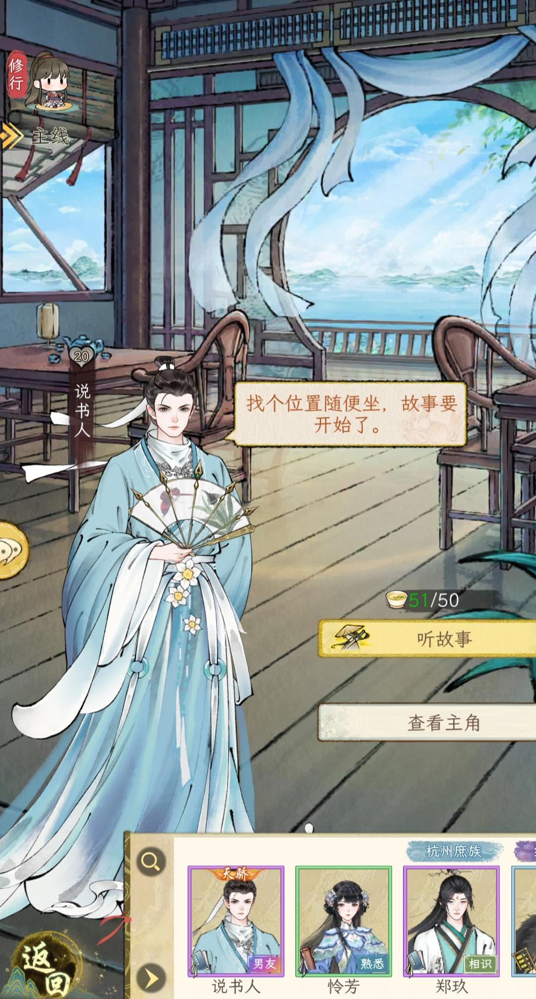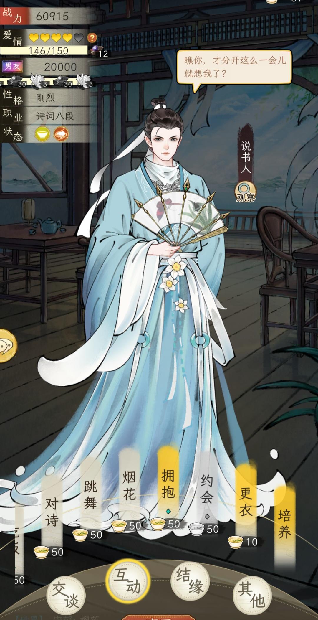 开了两个号发现说书人长得都一样且都没有封心状态,本来担心他是固定NPC不可换装,但表白之后发现可以更衣因为对比其他天骄NPC的初始装备他原来的衣服实在太寒酸了,于是痛花一千多银锭给他换装。我觉得说书人长得还是可以的,尤其是他年龄不详不老不死
