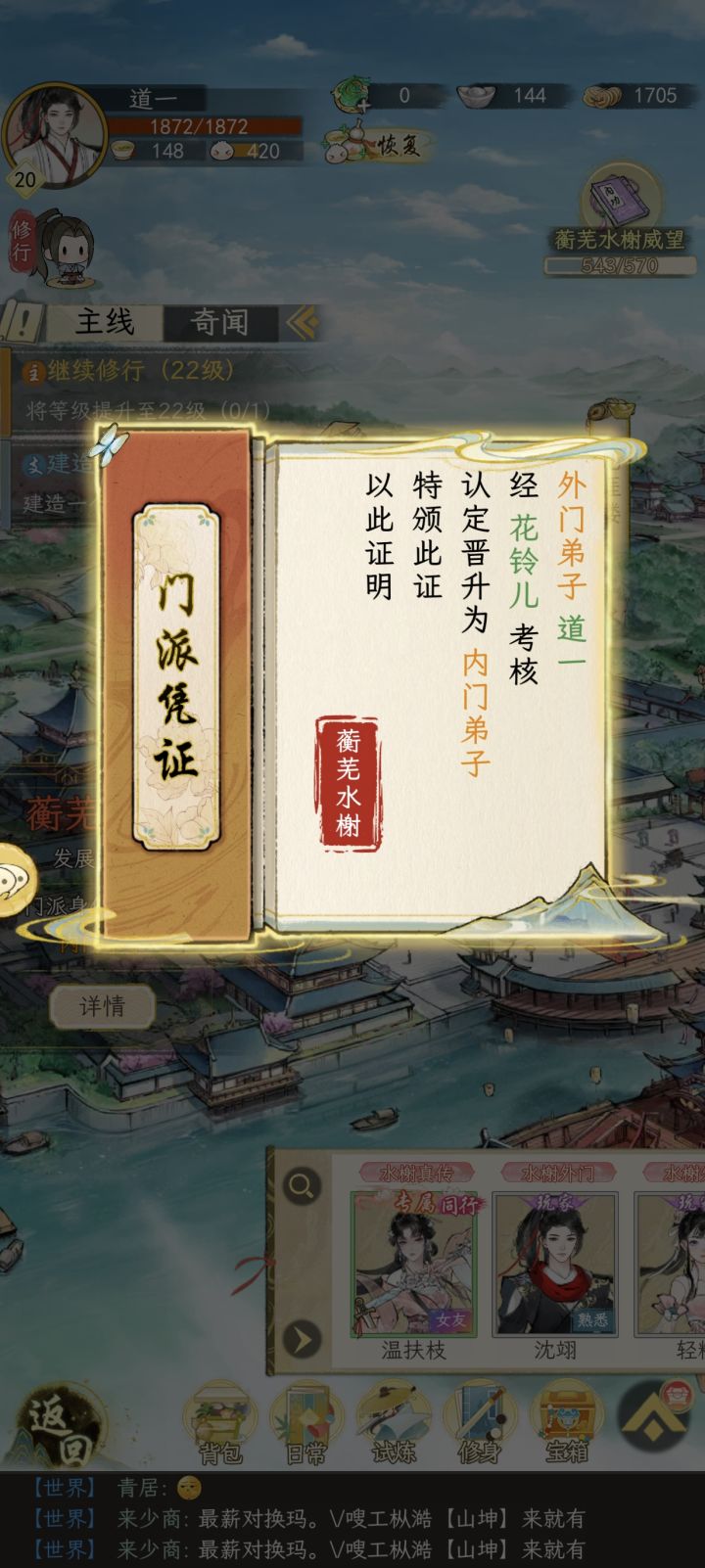 #华夏千秋 废话不多说:第一天要想从水榭外门到达水榭内门,有两个门槛,平民要肝,富贵要氪:1.禁疗诀(五气)最好红色,次金色。水榭内门关卡Boss300功,平民最多220左右,等级差距太大,但有机会!2.最重要的一点:男女朋友,第一天系统会让你有机会找到男女朋友,一定要通过,因为ta是三段剑士,成为男女朋友后要砸体力,可以等到第二阶段的亲密度以后跟随行走,帮你过考核BOSS!跟随要多尝试,