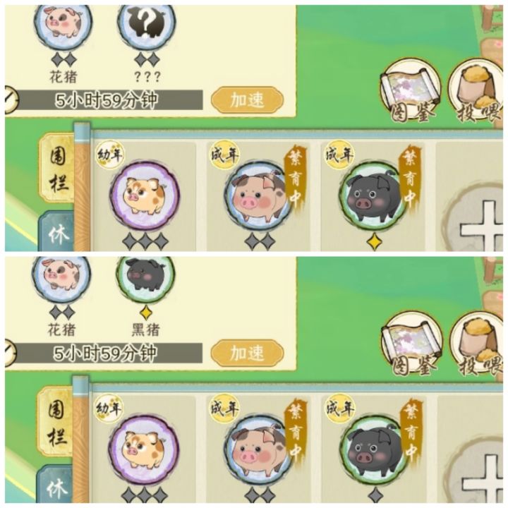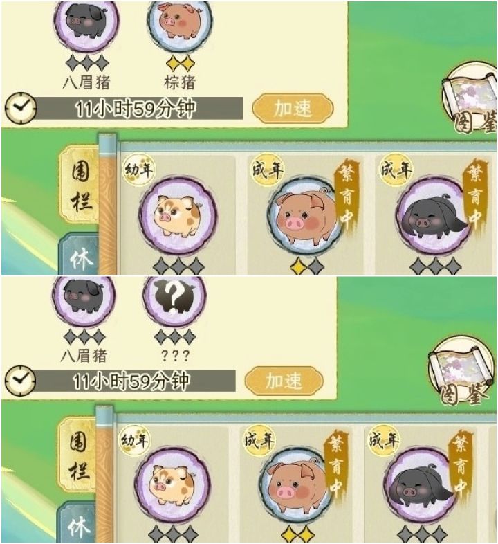 最近帖子有点小火了,有好多问题其实我也不太清楚了,我只玩了一测有些问题我也答不上来,希望有知道的UU们能帮忙解答一下——————加上飞天猪,还剩三只!尽力了,因为我以为培养出了所以紫猪(12h+24h)就能把金猪繁育信息都搜罗起来,没注意灵猪和招财猪同飞天猪一样,都是金猪+金猪才能繁育出来因为我有两个猪圈,最近几天其