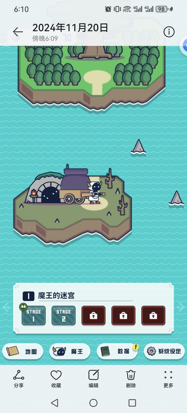游玩时间一个小时多一点进度为图二的第五关发现这个岛可以双指缩小,发现有这么多岛屿,不知道后面的需要多少魔晶还要刷多少##魔法融合厨房 刷起来升级好慢啊
