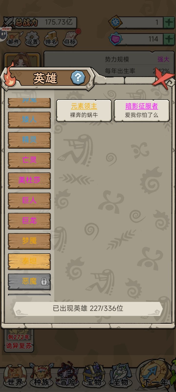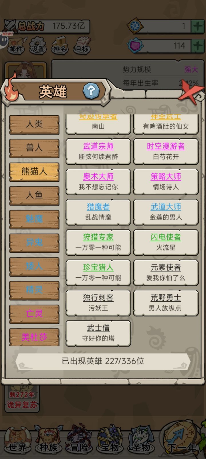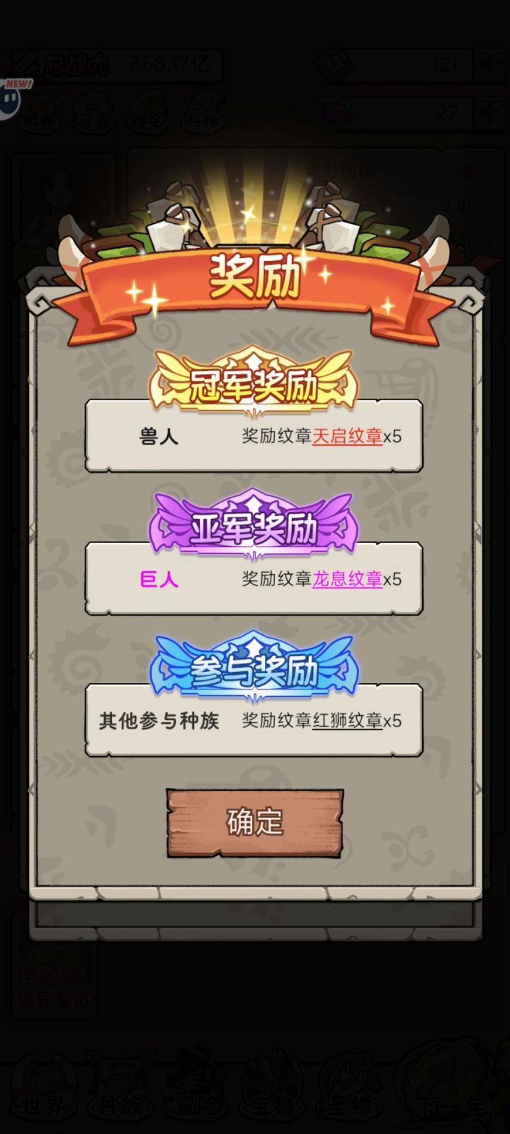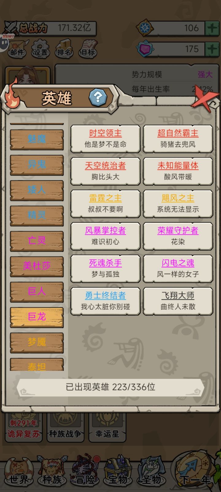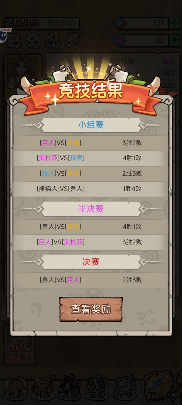 一直点点点 点完下一年你就可以看广告了。玩着玩着你会发现实际游戏时间可能不足广告时间的十分之一。 新种族的出现好像年份到了就出现了,没什么特殊操作。而战力的提升似乎只和人口有关,其他物品的提升聊胜于无。后面派对点个兽人或者人类等前期人口多的种族,战力能直接加1亿。呸~浪费时间打那么多字干嘛。总而言之,如果你喜欢看广告,你可以去爱奇艺追剧,而玩这个游戏你会变为广告连点器,甚至不如快手极速版给