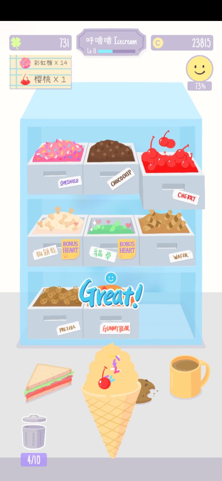 《猫猫狗狗冰淇淋》是一款休闲的收集装饰游戏。玩家将成为公园中一家冰淇淋的店主,向散落于公园四处的猫猫狗狗们出售他们所期望吃到的冰淇淋。在获得回报之后用以拓展和装饰他们所生活的家园。装饰功能还提供了针对不同家具类型的编辑工具,以增添摆放的自由度。在这百来件装饰物里,其中一些还带有互动的效果,可以观察到小动物们独特又可爱的行为。该游戏的核心乐趣在于制作与销售冰淇淋的过程,与动物们交朋友,让他们在精
