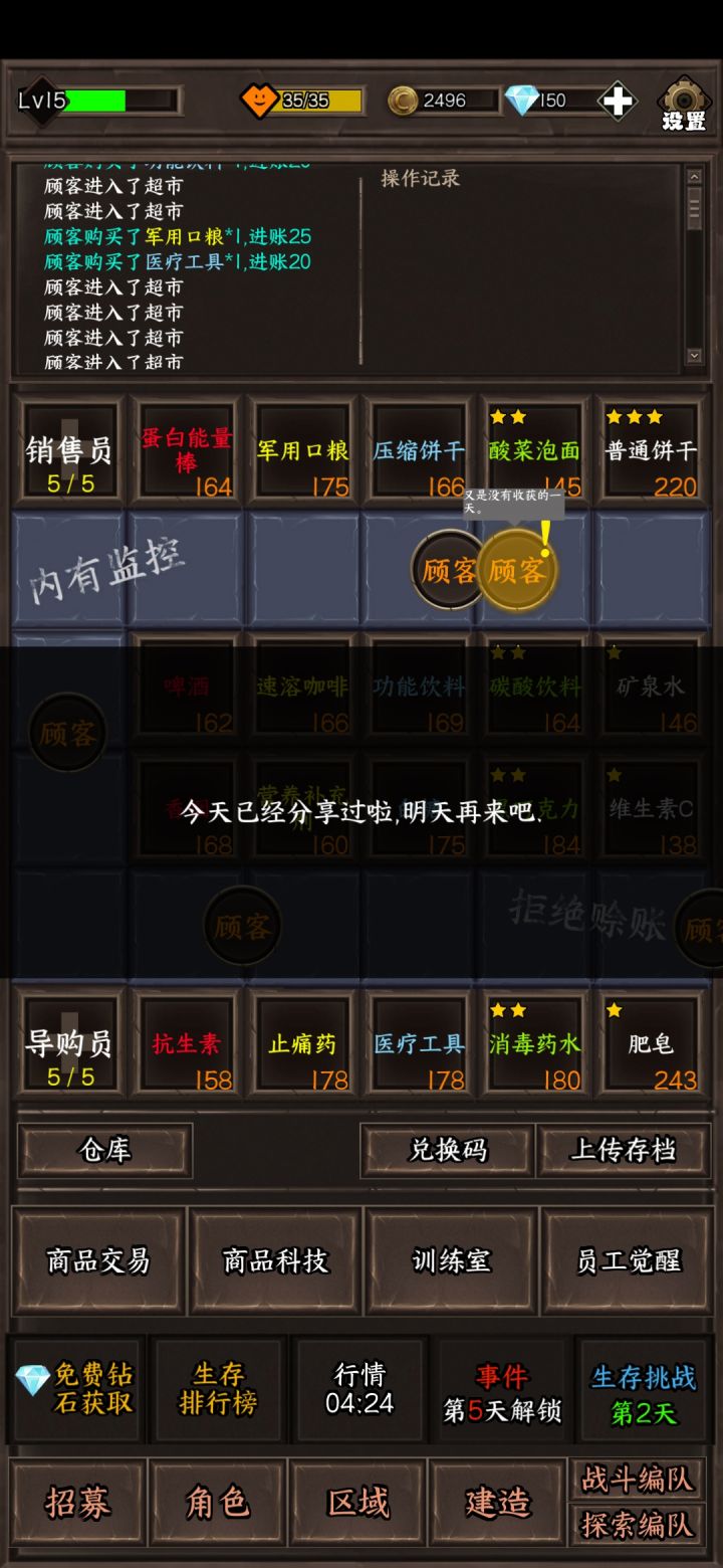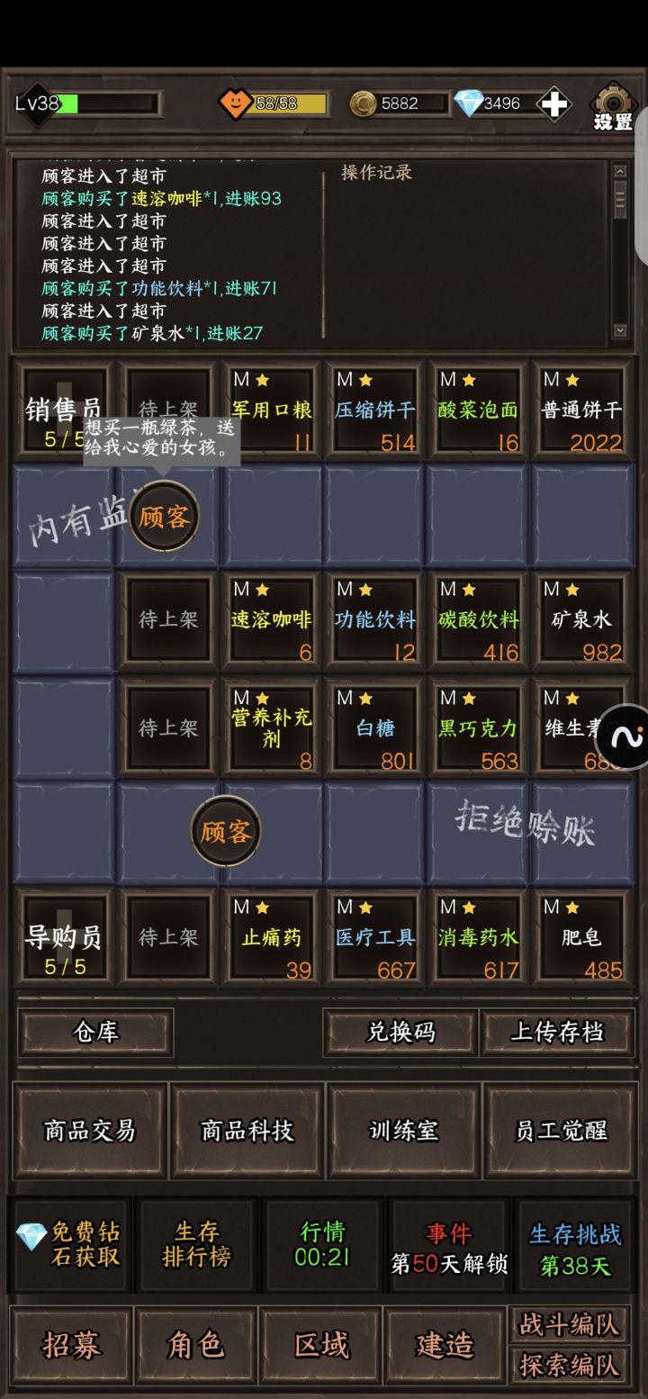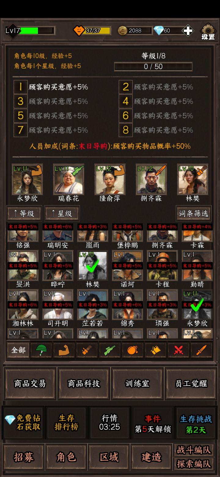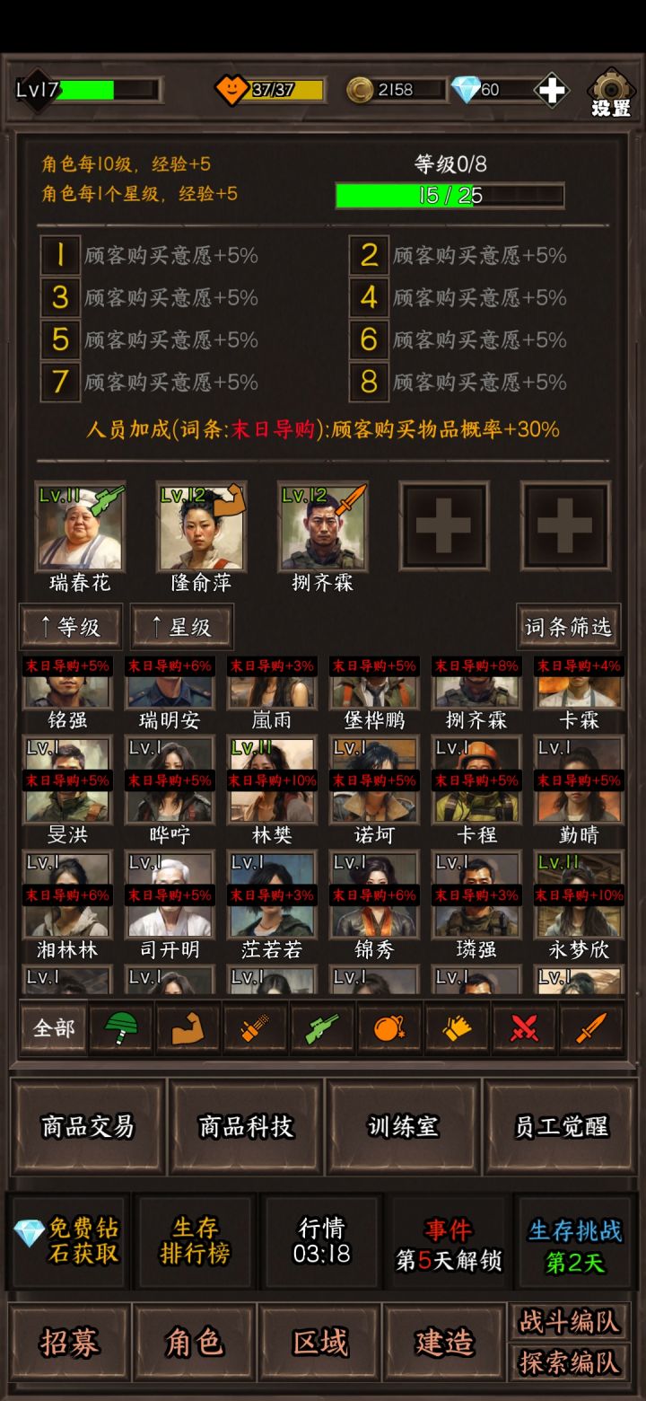 1.人物升级给个一键十级吧,先不说人多了一级一级的点有点麻烦,现在升级的时候还会卡一下2.探索区域可以考虑加个攻占的设定,就是战力或者其他条件满足了可以把那里变成安全区然后可以安排人周期性自动生产物资,毕竟就算探索两次出怪了也是挂机碾压打不如直接变成安全区