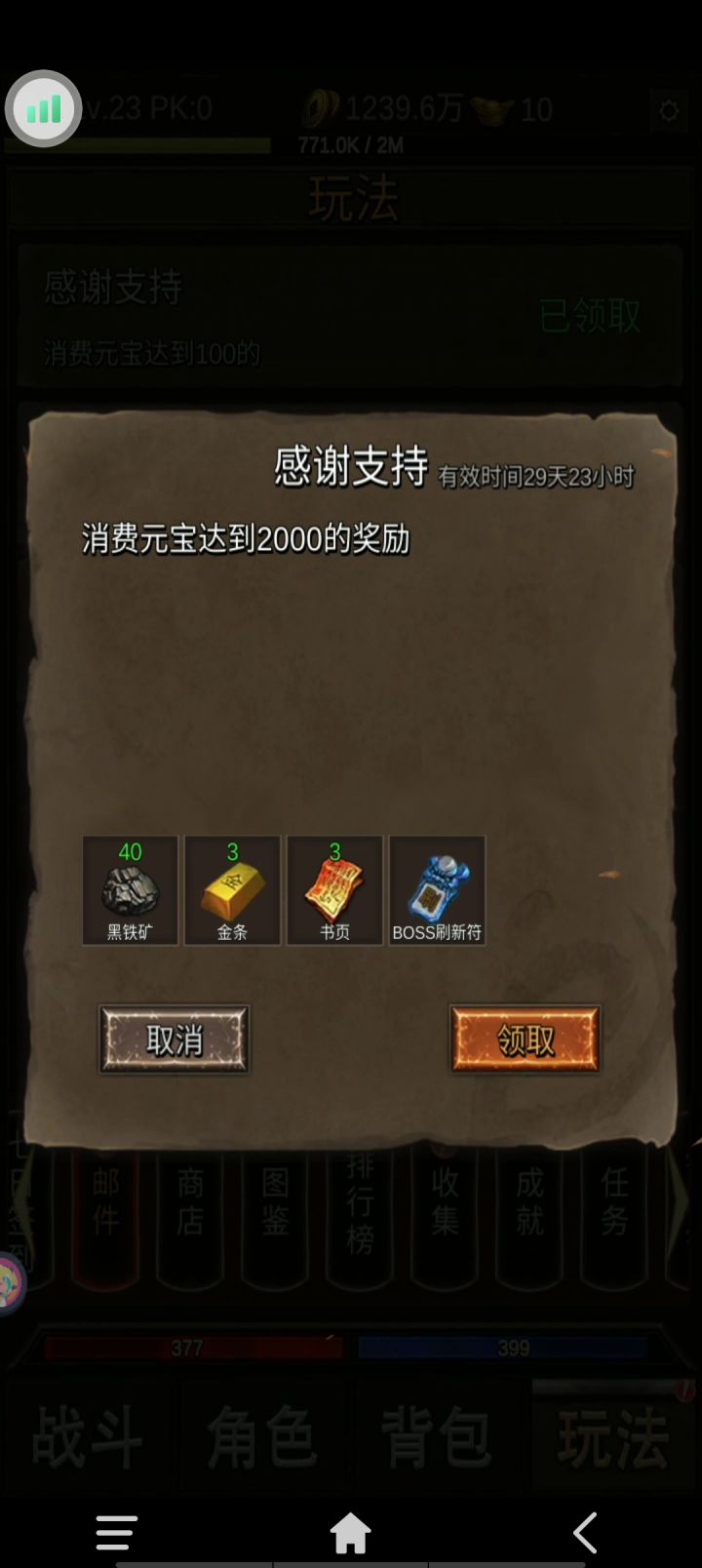 砸锅卖铁去强化超级新手友好攻略(猫猫镇楼)1-开局走流程速升级(有红包捡红包升级快很多,一般两个小时就能到29)2-开启抽奖以后梭哈金条全部抽奖,给的装备合成(2合1,优质词条:血量,攻击速度,5%概率群攻技能)3-开启图书馆后优先升级带攻速的(平均2天一个满书)4-装备搞好了开启盟重药店,每天八点到十点进去挂机,有元宝收益5-异兽随便选,我带的是先给攻速的6-技能方面,前期群攻为主