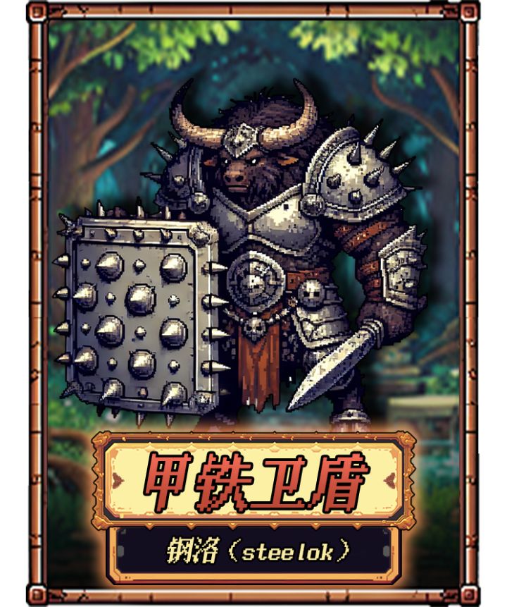 甲铁卫盾-钢洛钢洛是钢铁意志的化身,坚不可摧的防御和无与伦比的战技使其成为战场上的堡垒技能荆棘盾「反伤」钢洛受到近战攻击时将会反弹200%伤害给攻击者。应对策略技能卡推荐「恢复结界」恢复结界技能卡释放后立即生效,每0.5秒恢复场上所有角色9点血量,持续5S。威能卡推荐「恒星节点」、「生命符文」、「次时代吸血面具」、「不死族」恒星节点:光环,每3秒,治疗周围所有友方单位18点生