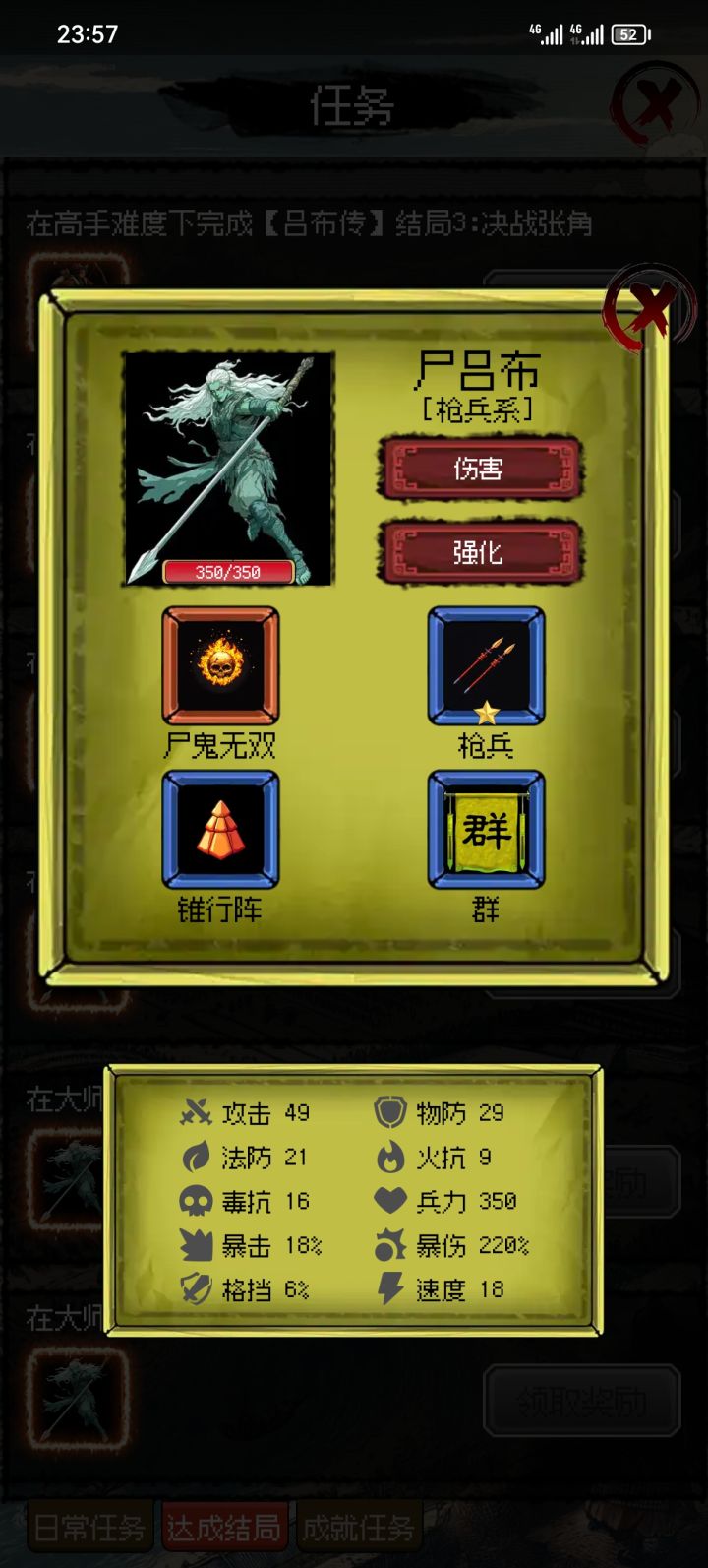 大家可以想想,有哪些角色被低估,或者高估了。少入坑,多种草。 一定要记住,最被低估的是主角,<<主角才是T0的存在>>,养什么都不如养主角来得舒服。下面开始正题:【低估①】张飞,新手决斗福将。避免新手吕布传单挑董卓,主角单挑挂了的解法。张飞普攻+1并暴击,基本每回合收益500%,低难度决斗董卓几乎不掉血,主角未发育可以作为决斗将出战(此外,周泰T不稳,技能变能给前排套盾估计可以,