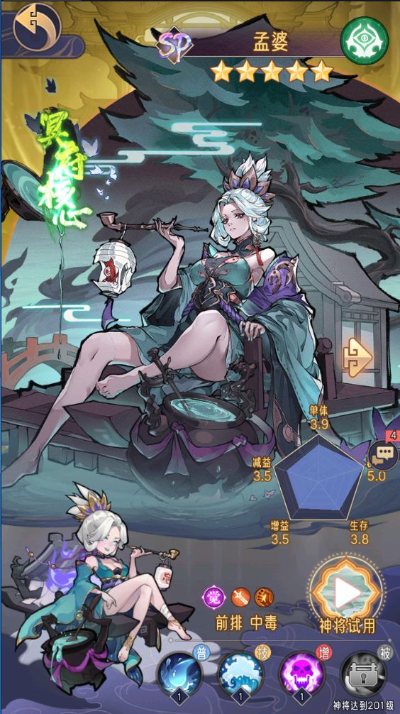 《逍遥九重天》的世界犹如星辰大海,每一个神将都是一颗璀璨的星。现在,让我们将目光聚焦在这颗耀眼的“明星”——孟婆,一起揭开它神秘的面纱,探寻其中的奥秘与策略。神将名称:孟婆 一、基本信息1.神将类型:输出型2.所属阵营:冥府3.稀有度:SP 二、技能描述1.主动技能:2.被动技能:三、卡牌优势1.在pve模式中的出色表现,例如在神魔试炼这种打桩的模式中,配合着中