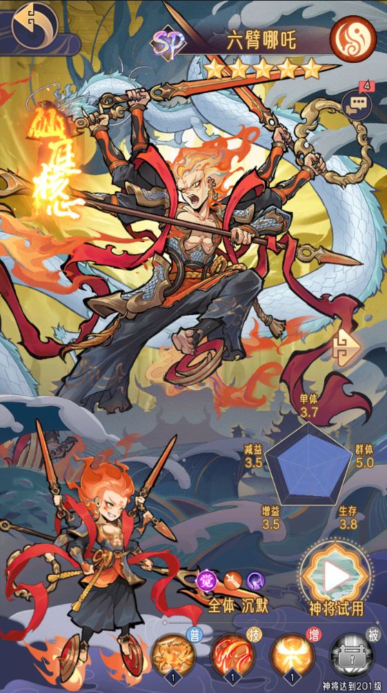在逍遥九重天的世界中,每个神将都拥有独特的魅力和策略价值。今天,让我们一同深入探索一个备受瞩目的神将——六臂哪吒,挖掘它背后的强大力量和精妙玩法。神将名称:六臂哪吒 一、基本信息1.神将类型:输出型2.所属阵营:仙庭3.稀有度:SP 二、技能描述1.主动技能:2.被动技能: 三、卡牌优势1.在pvp模式中的出色表现,例如在仙武台中,六臂哪吒的沉默和麻痹能极大程度