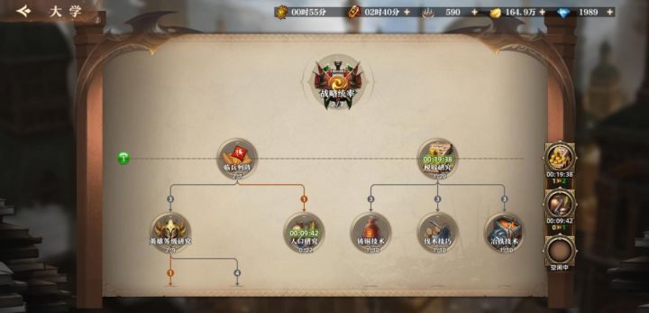 大学——《联盟纷争》一个不可或缺的系统,在这里你可以学到高阶谋略,开启高级兵种及兵法,解锁更多游戏玩法。下面让我们带您一起走进大学,进一步了解大学功能。一、大学功能1.可提升部队战斗力、提高跑商效率,升级高阶兵法等;2.解锁游戏功能,如解锁兵种、第二支部队、高品质贸易品生产等;3.谋略研究受领主个人声望值及前置谋略等级条件影响。二、研究加速/取消1.每日赠送2小时谋略免费加速,0点重置
