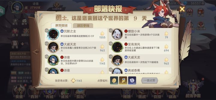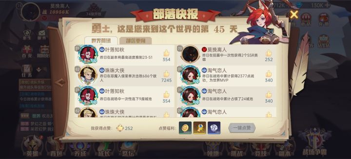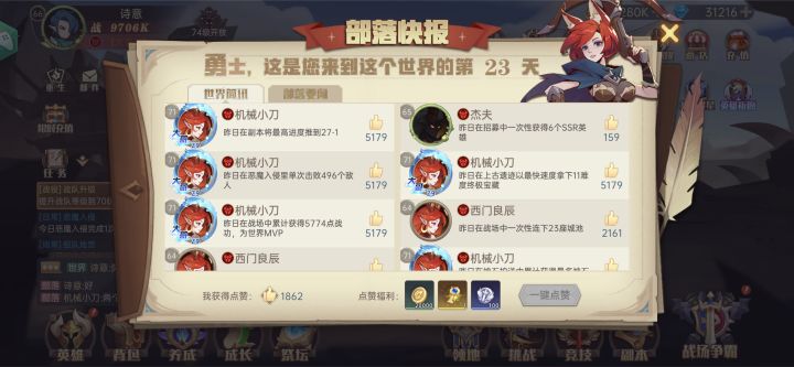 入坑决胜45天了,总体来说感觉还是不错的,福利给的也挺好,O氪也能慢慢做任务升级VIP,钻石前期给的也挺多,不充钱也能肝到UR英雄。但是期间小伙伴们都退游了,,诺大一个部落只剩下我自己了,部落就只有零散的几个人上线,以后区服之间会合服吗#决胜之心