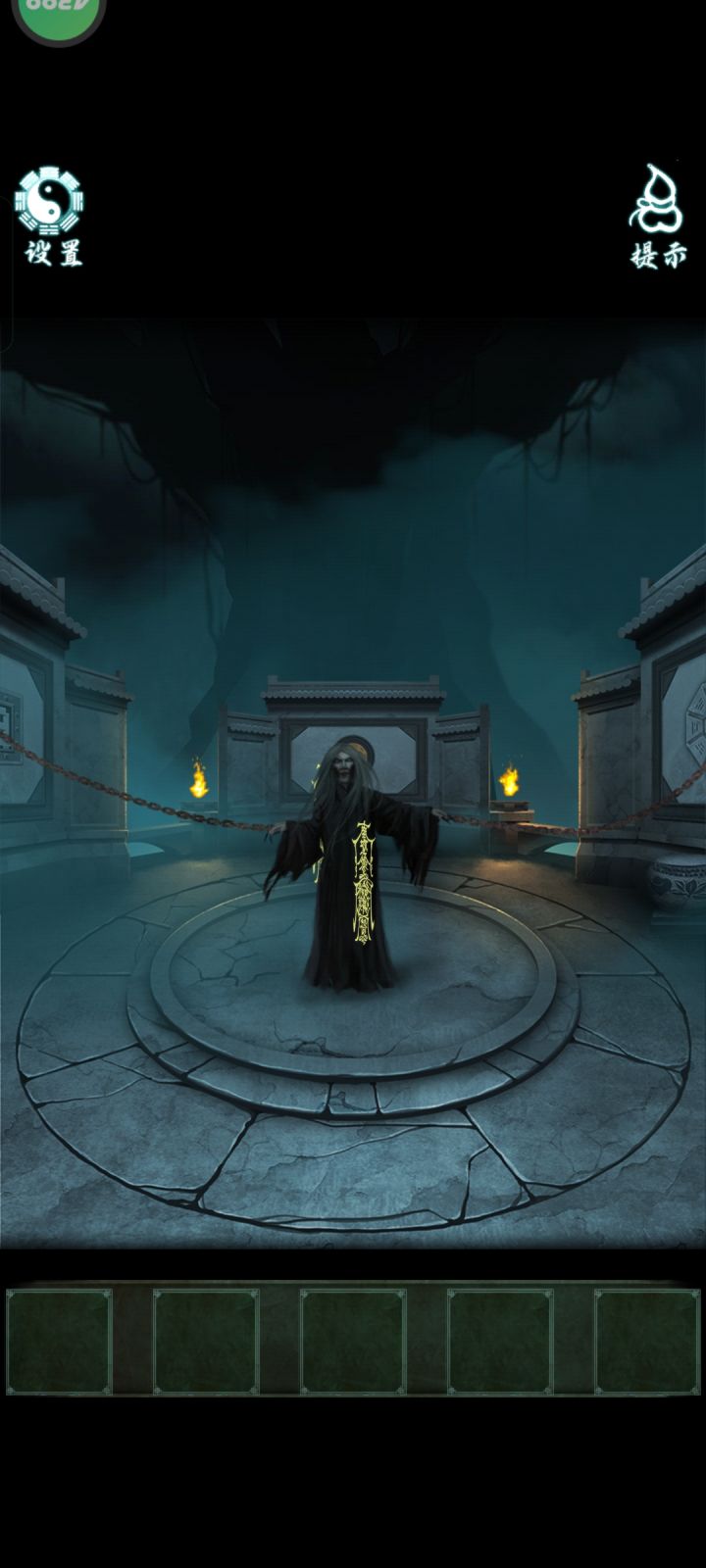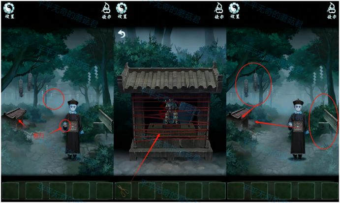 一、先点击迷雾(会回到原点),然后从小僵尸的手中拿到【剪刀】,用【剪刀】剪开【神龛】外面的【红线】,根据招魂幡下面的形状颜色和指路牌上的符号颜色,还有神像后面的符号颜色,即开神像底下的盒子,如下图,然后就能获得【线香】、【火柴】、【红宝石】。二、查看神像后面的书,知道相应神兽符号对应的前进方向,根据提示,获得前进的方向为,【左右右左直行】,将【红宝石】放到小僵尸的手中,之后就能通过了。三、从掀