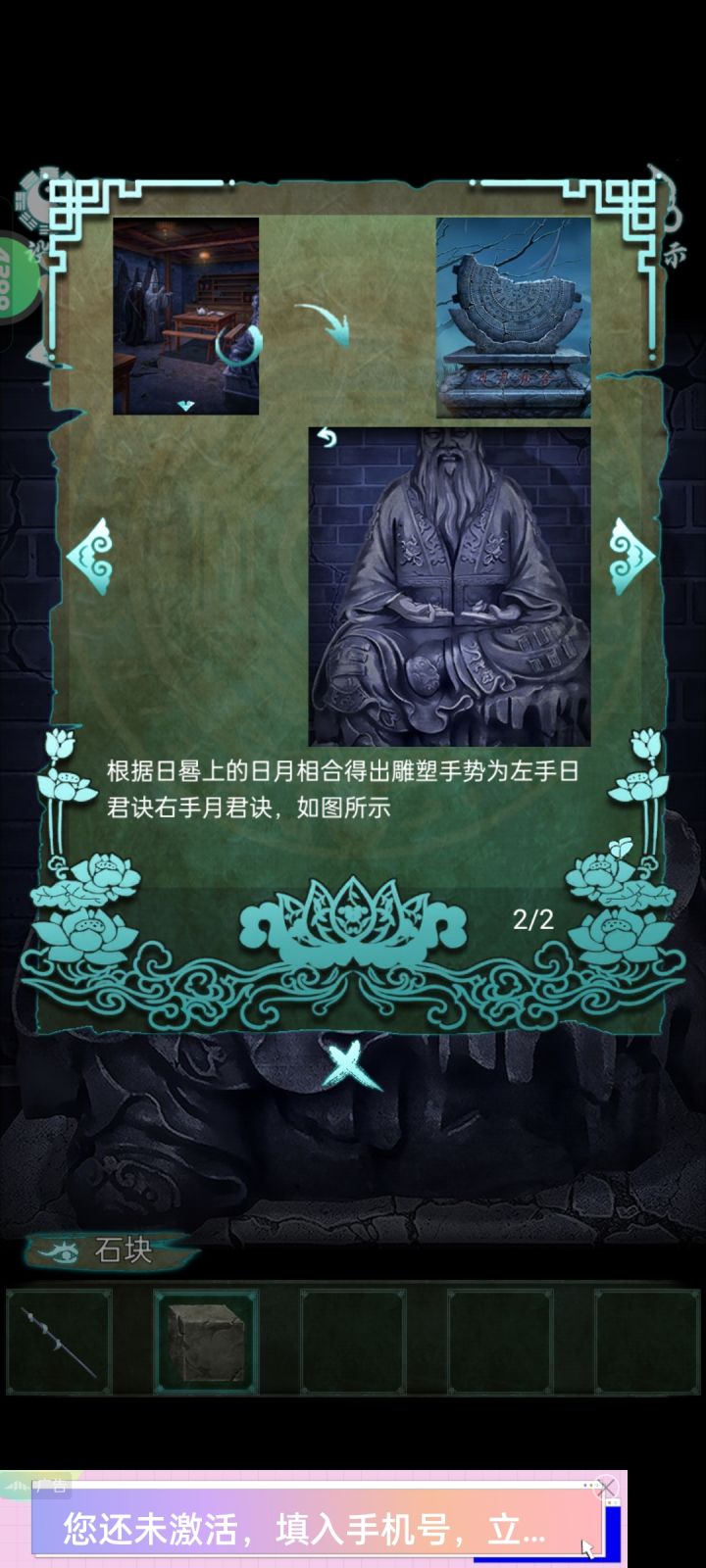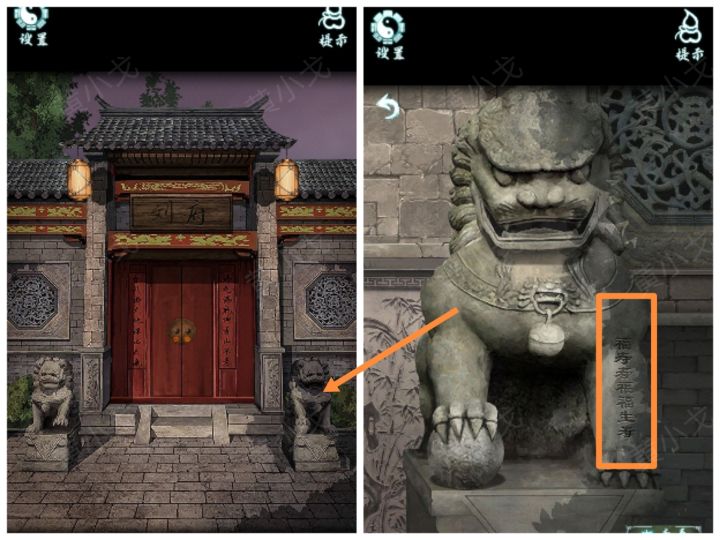 | || ||||||第一章:开坤吉1.(刘府外)点击右边的石狮子,获得线索(福寿寿福福生寿)2.点击查看门上的对联(春风拂大地绿水长流、瑞气满乾坤青山不老)3.点击门上的锁,根据上面的字(左-寿、右-福),结合石狮子上的刻字(福寿寿福福生寿),按(右左左右右左)的顺序点击门环,打开门4.(正厅)点击查看花圈上的挽联,获得线索(守孝不知红日落,思亲常望白云飞)5. 点击桌子,查