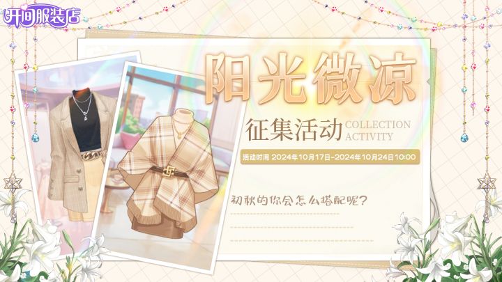 各位闪耀的店长大家好呀~~秋意渐浓,阳光微凉,又到了初秋不知该穿什么衣服的时节了。街上来来往往的行人总能穿出四个不同的季节,在这样继续穿搭灵感的时候,不如来《开间服装店》来找找灵感吧!现在参与本次「阳光微凉」话题讨论,分享3套初秋穿搭,即可获得活动好礼!活动时间:2024年10月17日-2024年10月24日10:00发奖时间:2024年10月25日🎁🎁活动好礼:大额支票*5,快递箱*1
