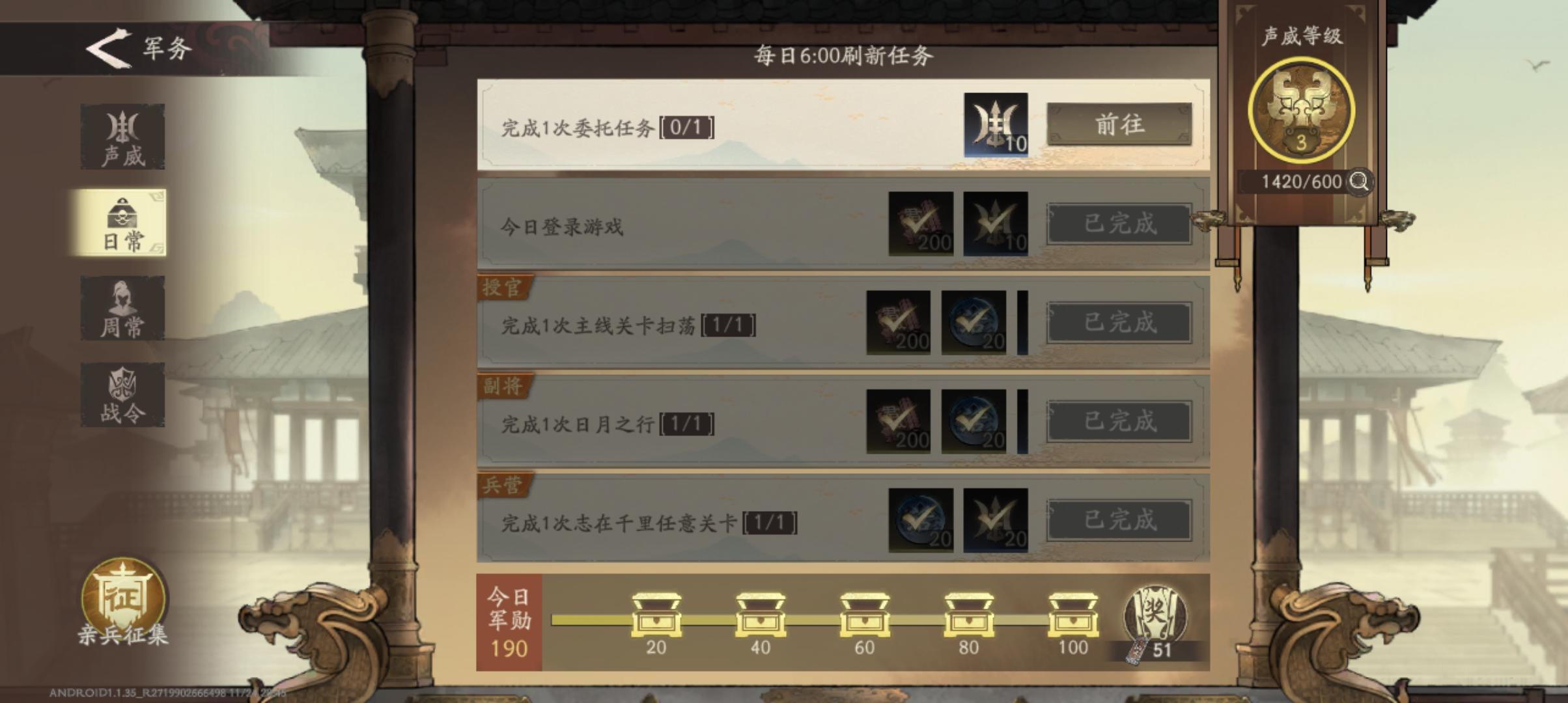 客服,每日委托任务出bug了,不知道是不是只有我的这个有问题。卡在这,一直刷新不了。点击领取奖励也点不了。麻烦修复一下,不然亏了每天的副将材料啊!!!