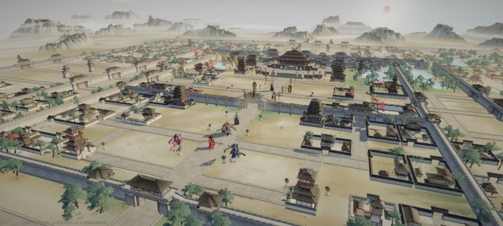 水墨丹青中的三国世界《三国望神州》(前身为《代号南乡子》)是一款由弹指宇宙开发的双端(手游+PC)游戏。游戏采用中国传统水墨工笔画风,将三国乱世的恢弘画卷徐徐展开。用水墨线条风格,搭配清丽淡雅的景色和建筑,色彩分明的人物装饰,让人不禁想起光荣经典策略游戏《三国志11》的美术风格。游戏在美术表现上采用了3D与2D相结合的方式:战场和城镇环境以3D呈现,虽不支持自由旋转视角,但可以改变摄像机镜头拉