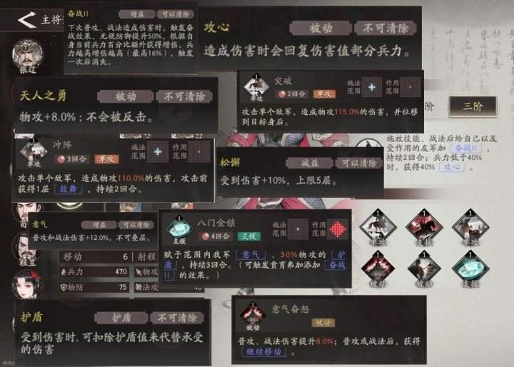 UID:10260002139剧本等级:30级 金坛奇正,得之於怀抱,玉钤攻取,无劳於积习,祭遵儒术,未足方其雅歌,曹仁智勇,才可用其胜。 当我第一次看到曹仁的那个技能面板时,我心里只有一句话:将军真乃天神下凡。将军虽然自带超高面板但技能仅仅只有回血,增伤,增防,减防,真伤,护盾,位移,再动,不被反击和范围增益,还能斩敌将如杀鸡屠狗,这还是削过的效果,在下实在是佩服佩服。 武将简介:可以#三国望神州