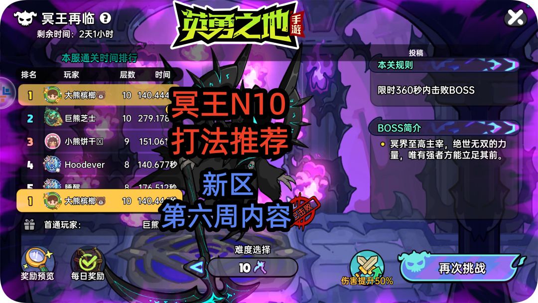 英勇之地手游:冥王10 打法推荐,新区第六周内容