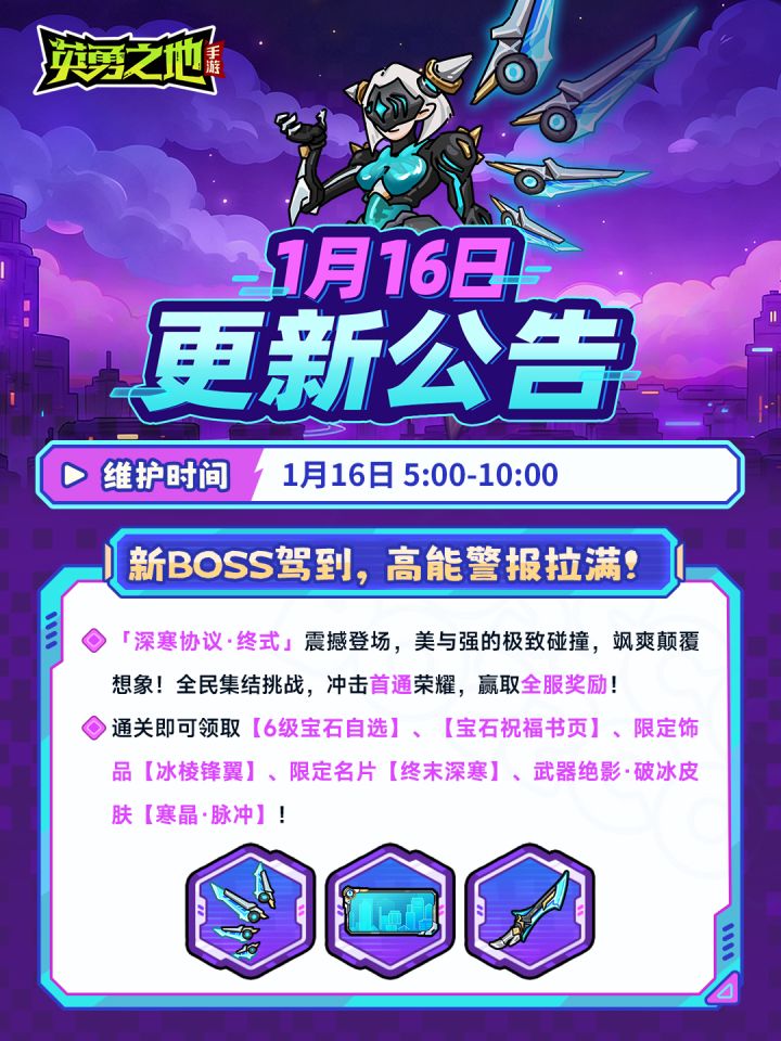 勇士们听我说急急急,冲击全服奖励的好事儿没你真不行!全新玩法【终焉之战】即将来袭,速来集结~还有你期待的新天赋宝珠、新皮肤同步上线!更有大家最最关注的多项优化调整上线!快查收1月16日更新公告吧~(爱心提示:还有后续版本的抢先预告哦(^_−)☆)#发现好游戏 #游戏日常 #英勇之地暖冬冰雪节 #英雄之地手游