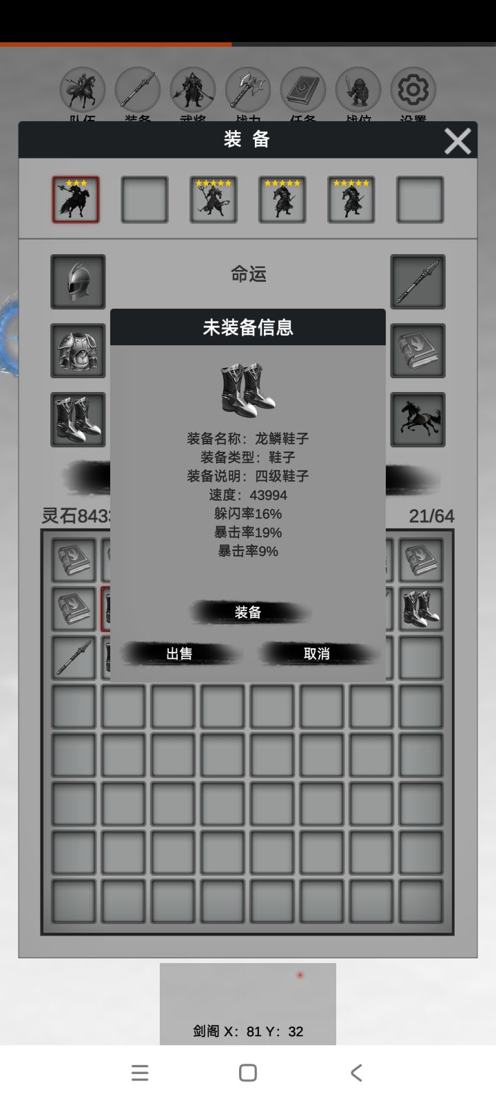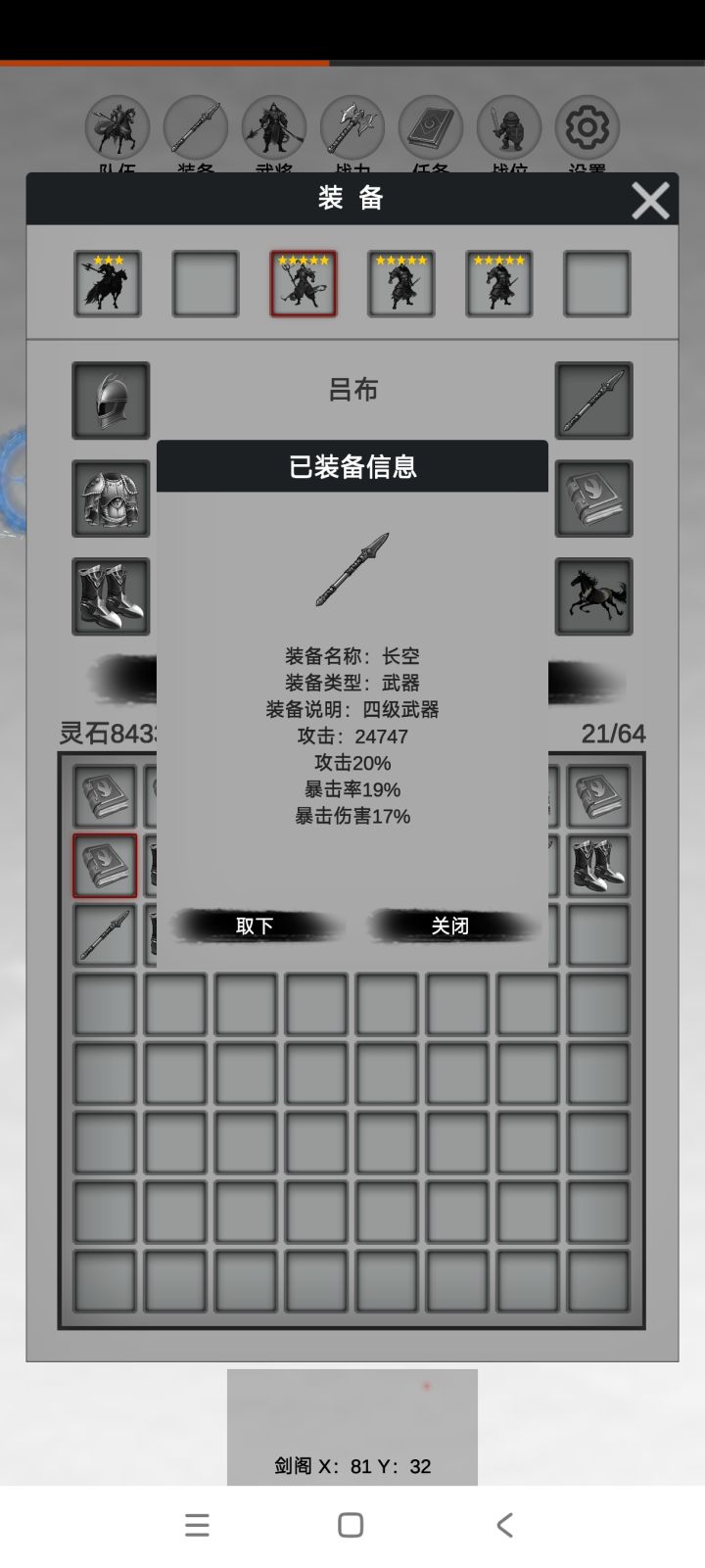 开局穿上武器打吕布(白嫖建议雷,其他基本玩不了,雷要穿防御装)然后退,再登开局记得找管理要华佗(不要也无所谓了)然后不停退,登,把六套装备捡齐,捡伙伴(至少要捡一个先锋,和两个长枪兵/刀斧兵)阵容为1先锋2先锋3华佗4长枪兵/刀斧兵5吕布6主角直接打张宝挂够一万灵石进下一章图打华雄(挂机抓单)(解释一下挂机抓单:进地图后不要走,直接点屏幕上方的1800秒的挂机,之后每隔几秒会出一波单怪,
