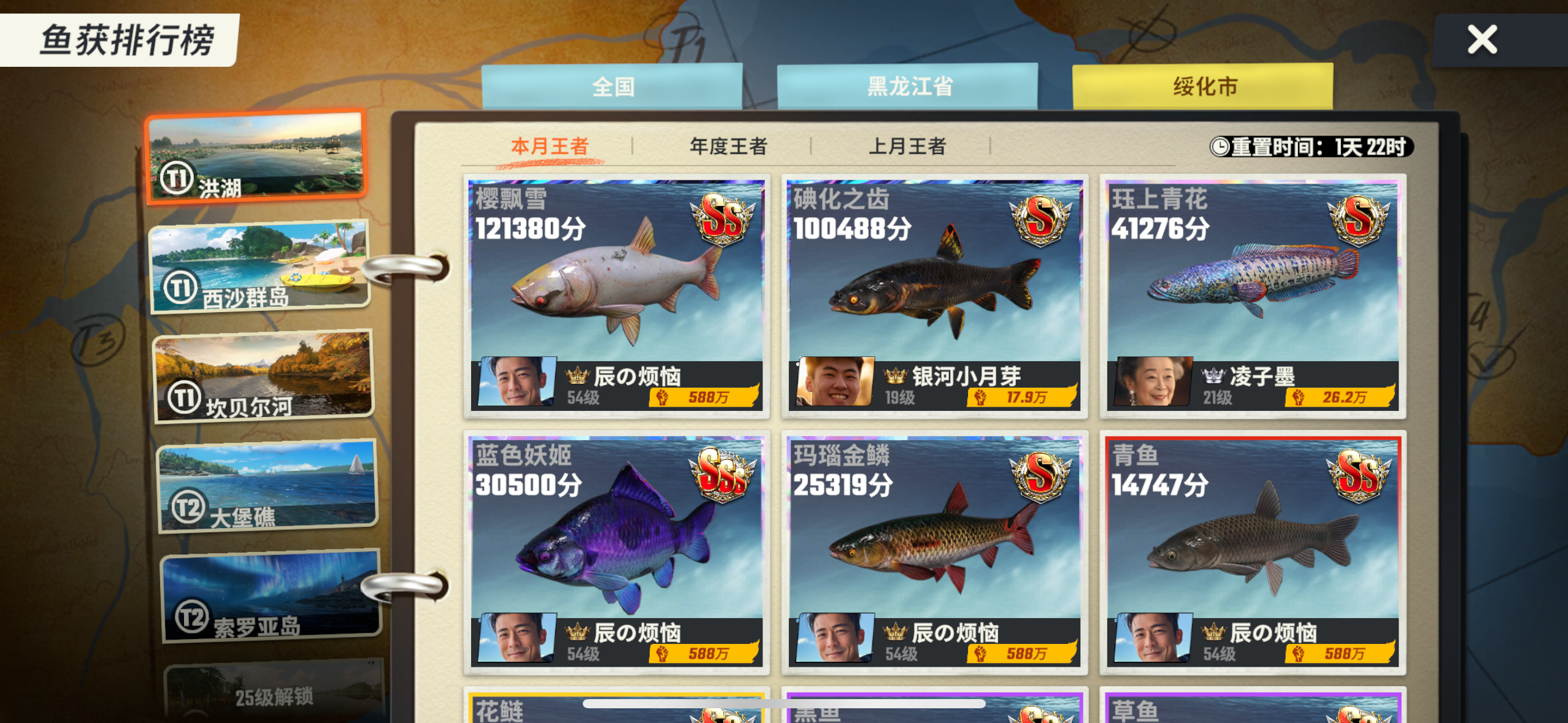 在这里,有几个问题想反馈一下 1: 我建议5分钟一体力改改,一个小时就是12体力,不够用,完全不够用,相当于一个小时甩一杆,有点饥饿营销。2:可以增加宝箱掉体力,游轮票都是可行的,开宝箱有个开一个五个十个,一次性全开完,有点太强求了,有些玩家喜欢单独开呢,因为都是自己辛辛苦苦攒起来的3:减少游戏升级经验,后面经验升级太长了或者t1t2t3各增加1-2个新地图,增加游戏的可玩性,不然每天都是同样的钓