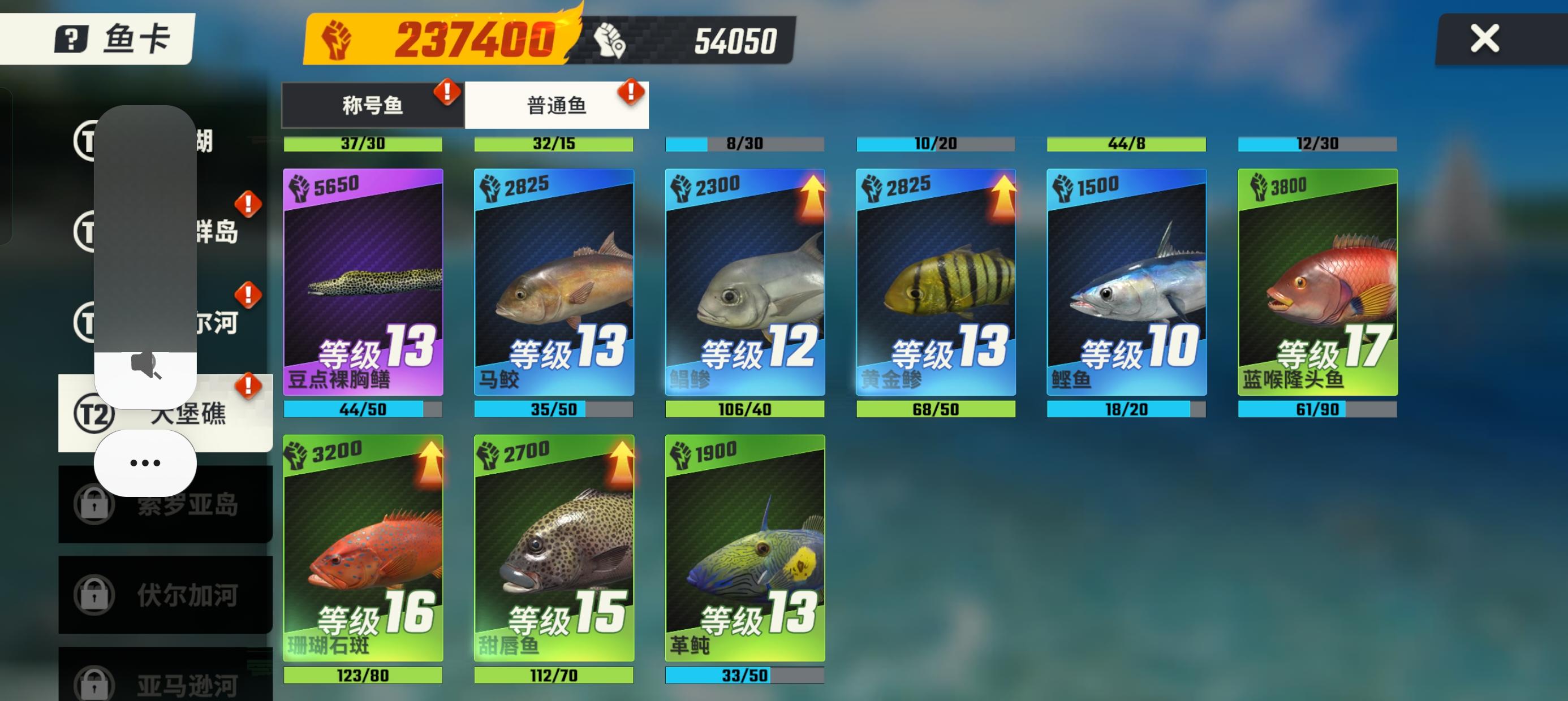 第一鱼卡能不能给个一键跳过,看鱼卡毫无意义,浪费时间。第二升级鱼卡能不能给个一键升级,一个一个点恶心人啊。第三一些鱼死活没遇到,能不能设置一些buff ,提高一下目标鱼的概率。