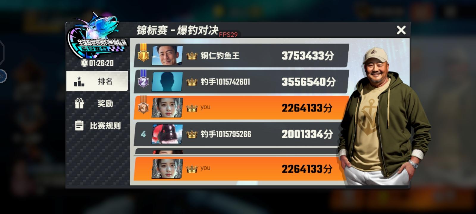 这个锦标赛刚开始拿了第一名,70万分一个闪退,进去,直接有一个350万分的,有必要这么搞吗?就算你普通钓的你也标一个分在那里啊,这样一搞闪退,直接这么多分合理吗?