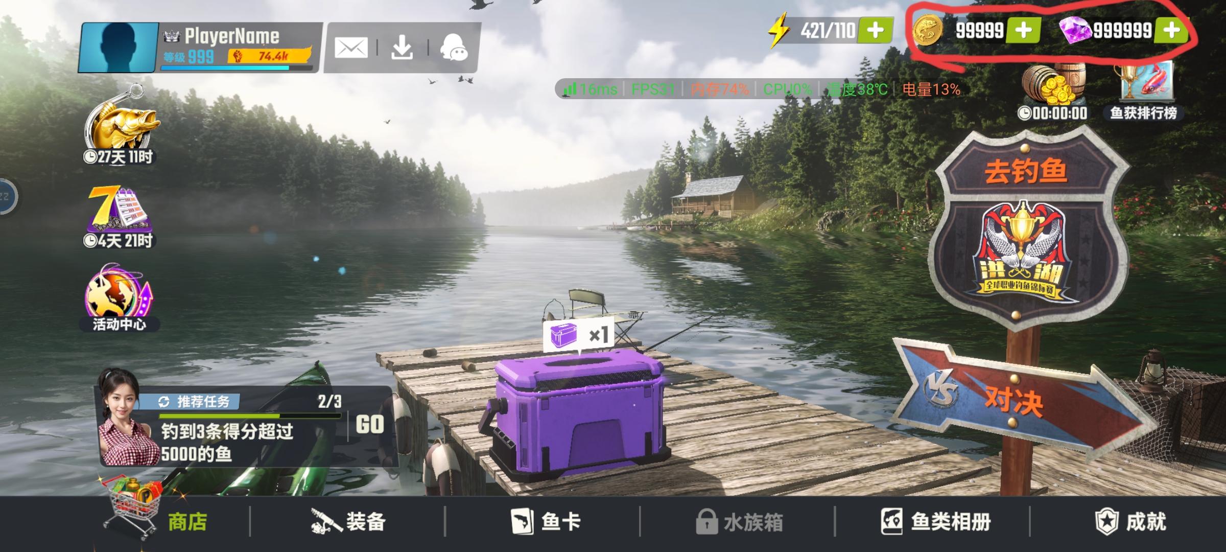 #欢乐钓鱼大师 我就问问,我第1天玩就没成这样。今天就这样,官方你看这个金币和钻石啊999,我还没玩多少天呢?就已经有这么多钱了,再说了那个等级一下100级了?今天今天准备玩的时候,还进不去,游戏的界面是可以进去,但不过你进去钓鱼一片空白?我是卡了吗?还是?